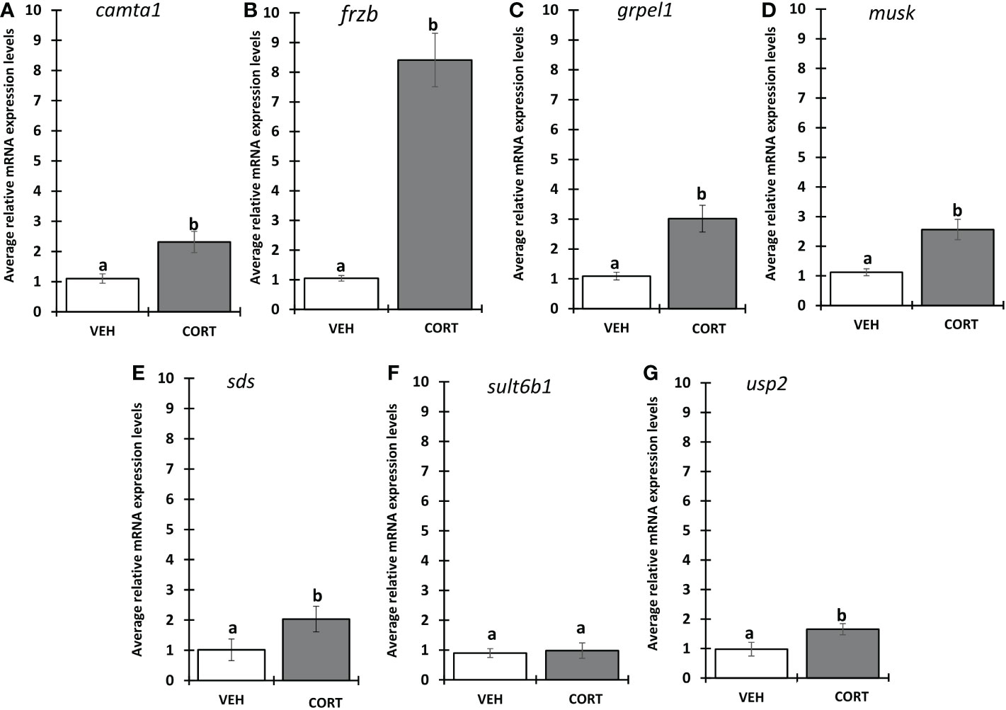 FIGURE 1 Evaluation of CORT response in selected genes. Premetamorphic tadpoles at Nieuwkoop and Faber stage 54 (NF54) were treated with vehicle control or 100 nM CORT (corticosterone) for 24 hours followed by tail RNA extraction and quantitative PCR to quantify mRNA expression using gene specific primers for (A) calmodulin binding transcription activator 1 (camta1), (B) frizzled related protein (frzb), (C) GrpE like 1, mitochondrial (grpel1) (D) muscle associated receptor tyrosine kinase (musk), (E) serine dehydratase (sds), (F) sulfotransferase family 6B member 1 (sult6b1), and (G) ubiquitin specific peptidase 2 (usp2). Bars represent mean mRNA levels relative to the housekeeping gene rpl8 and normalized to a vehicle control sample. n = 10 tail samples per treatment. Error bars represent SE. Letters indicate significant groups, p < 0.05. |