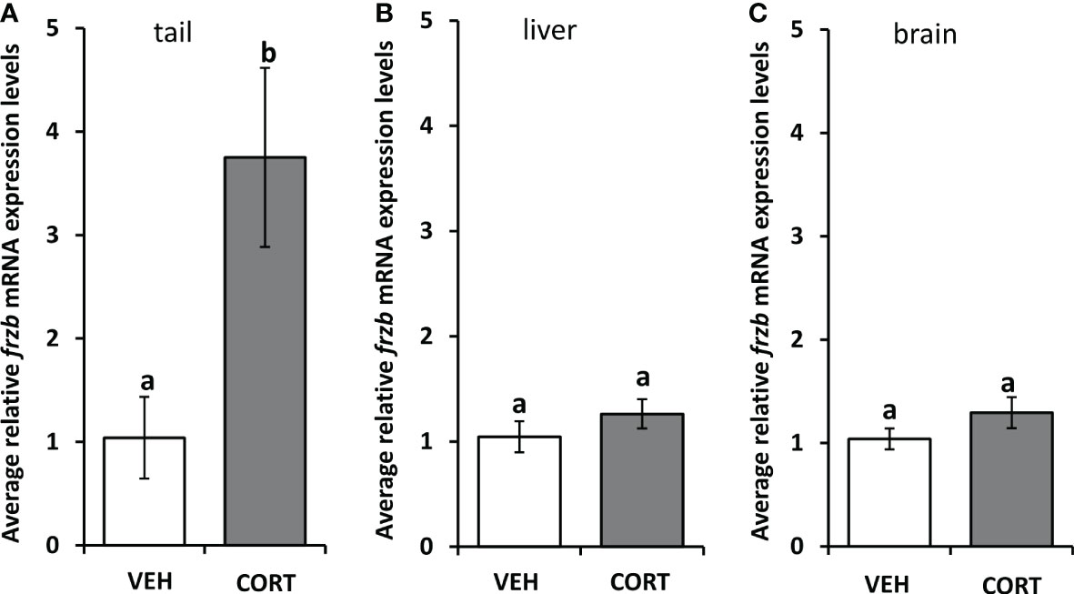 FIGURE 3 Tissue expression profile of frzb in tadpoles. Premetamorphic tadpoles (NF 54) were treated with vehicle and 100 nM CORT (corticosterone) for 24 hours. Tails (A), livers (B), and brains (C) were dissected, followed by RNA extraction and quantitative PCR to measure mRNA expression of frzb and the housekeeping gene rpl8. Bars represent mean mRNA levels relative to rpl8 and normalized to a vehicle control sample. n = 10 tail samples per treatment. Error bars represent SE. Letters indicate significant groups, p < 0.05. |