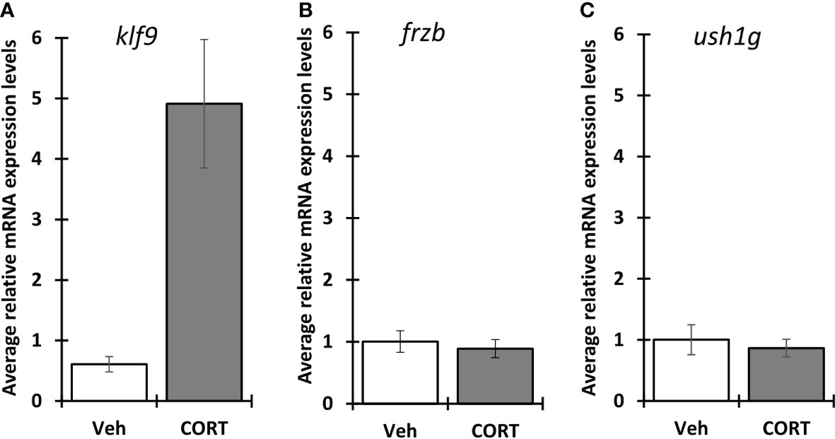 Figure 7. Induction of klf9, frzb and ush1g in X. laevis. Premetamorphic (NF 54) X. laevis tadpoles were treated with vehicle control or 100 nM CORT (corticosterone) for 24 hours followed by tail RNA extraction and quantitative PCR to quantify mRNA expression of klf9
