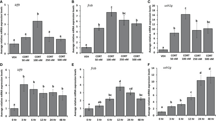 FIGURE 6 Dose response and time course for CORT induction of frzb, ush1g, and klf9 in tadpole tails. (A-C) Premetamorphic tadpoles (NF 54) were treated with vehicle and 50, 100, 250, and 500 nM of CORT (corticosterone) for 24 hours. (D-F) Premetamorphic tadpoles (NF 54) were treated with 100 nM CORT for 0, 3, 6, 12, 24, and 48 hours. Tails were dissected from tadpoles followed by RNA extraction and quantitative PCR to measure mRNA expression of frzb, ush1g, and klf9 and the housekeeping gene rpl8. Bars represent mean mRNA levels relative to rpl8 and normalized to a vehicle control sample. n = 10 tail samples per treatment. Error bars represent SE. Letters indicate significant groups, p < 0.05. |