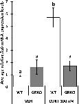 Figure 5. Impaired frzb induction in glucocorticoid receptor knockout (GRKO) tails. Premetamorphic wild-type and GRKO tadpoles (NF 54) were treated with vehicle control or 100 nM CORT (corticosterone) for 24 hours followed by tail RNA extraction and quantitative PCR to quantify mRNA expression of frzb and the housekeeping gene rpl8. Bars represent mean mRNA levels relative to rpl8 and normalized to a vehicle control sample. n = 10 tail samples per treatment. Error bars represent SE. Letters indicate significant groups, p < 0.05. |