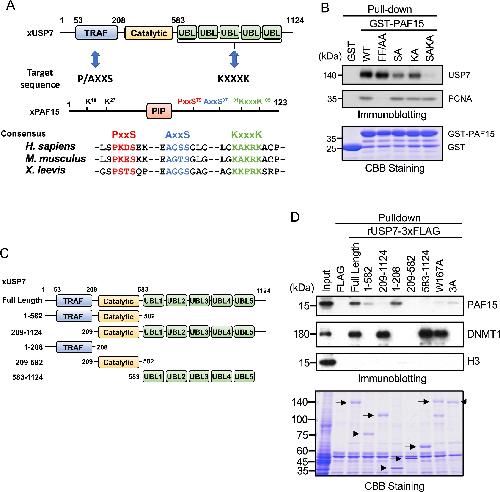 Figure 2. PAF15 associates with the TRAF and UBL1-2 domains of USP7. (A) Schematic illustration of PAF15-USP7 binding experiment. USP7 recognizes P/A/ExxS or KxxxK motifs in its substrates via TRAF or ubiquitin-like (UBL) domains, respectively. PAF15 has three motifs, and alanine mutations were introduced at S79, S97, K101, and K105. (B) GST pull-down from the interphase egg extracts using GST-PAF15, P/AxxS mutant (S79A/S97A; SA), KxxxK mutant (K101A/K105A; KA), and triple mutant (SAKA). The samples were analyzed by immunoblotting using the antibodies indicated. Purified GST or GST-PAF15 mutants used in pull-down assay were stained using CBB. (C) Schematic illustration of rUSP7 truncation mutants employed in (D). (D) FLAG pull-down from interphase egg extracts using rUSP7-3xFLAG mutants presented in (C), W167A and 3 A point mutants. USP7 3 A: D780A/E781A/D786A. The samples were analyzed by immunoblotting using the antibodies indicated. Samples were also stained by CBB. Arrowheads indicate rUSP7 truncation mutants and point mutants. Source data are provided as Figure 2—source data 1. |