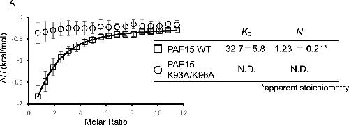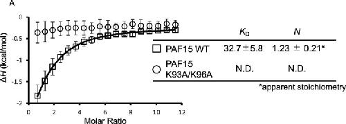 Figure 2—figure supplement 1. hUSP7561-1102 interacts with hPAF15 dependently on KxxxK motif.(A) Superimposition of plots of enthalpy changes in the interaction between hUSP7561-1102 and full-length hPAF15 wild-type (WT) or K93A/K96A mutant by isothermal titration calorimetry (ITC) measurement. Data are presented as mean ± SEM from three biological replicates. Figure 2—figure supplement 1—source data 1. Figure 2—figure supplement 1 ITC. |