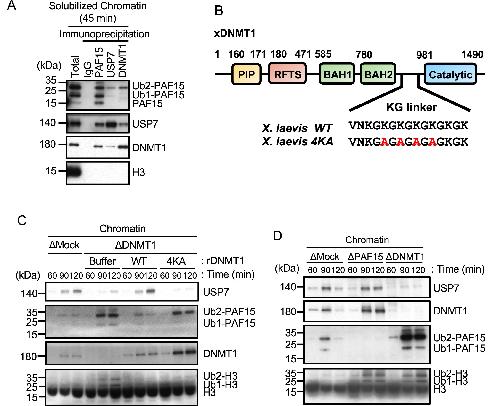 Figure 4. USP7 is recruited to chromatin through the interaction with DNMT1 for PAF15 deubiquitylation. (A) Sperm chromatin was added to interphase extracts. Replicating chromatin was digested by micrococcal nuclease (MNase). Immunoprecipitation was performed by PAF15, USP7, and DNMT1 antibodies from the solubilized chromatin fraction, and the samples were analyzed by immunoblotting using the antibodies indicated. (B) Illustration of DNMT1 domain structure. The KG linker located between the bromo-adjacent homology (BAH) domain and catalytic domain contributes to interaction with USP7. rDNMT1 4KA mutant, using in (C), was introduced mutation at four lysines to alanine in the KG linker. (C) Sperm chromatin was added to Mock- or DNMT1-depleted interphase extracts supplemented with either buffer (+Buffer), wild-type rDNMT1-3xFLAG (+WT), or rDNMT1 4KA-3xFLAG (+4 KA). Chromatin fractions were isolated, and the samples were analyzed by immunoblotting using the antibodies indicated. (D) Sperm chromatin was added to Mock-, PAF15-, and DNMT1-depleted extracts. Chromatin fractions were isolated, and the samples were analyzed by immunoblotting using the antibodies indicated. Source data are provided as Figure 4—source data 1. |