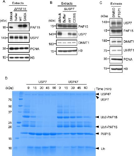Figure 3-figure supplement 1. USP7 directly deubiquitylates PAF15 to promote PAF15 chromatin dissociation. (A) rPAF15 WT-3xFLAG or SAKA-3xFLAG were added to PAF15-depleted extracts. The extracts used in Figure 3A were analyzed by immunoblotting using the antibodies indicated. (B) rUSP7 WT-3xFLAG or C225S-3xFLAG were added to USP7-depleted extracts. The extracts used in Figure 3B were analyzed by immunoblotting using the antibodies indicated. (C) Interphase egg extracts supplemented with dimethyl sulfoxide (DMSO) or the USP7 inhibitor FT671 used in Figure 3C were analyzed by immunoblotting using the antibodies indicated. (D) Ubiquitinated PAF15 was prepared by in vitro ubiquitylation using E1 (mouse UBA1), E2 (UBE2D3), E3 (UHRF1), ubiquitin, and C-teminal FLAG tagged PAF15. The reaction mixture was boiled, and the precipitant was removed by centrifugation. The supernatant containing ubiquitinated PAF15 was incubated with 50 nM recombinant USP7 or USP47. Incubations were stopped at the indicated time by adding SDS-PAGE loading buffer and analyzed by CBB staining. Source data are provided as Figure 3—figure supplement 1—source data 1. |