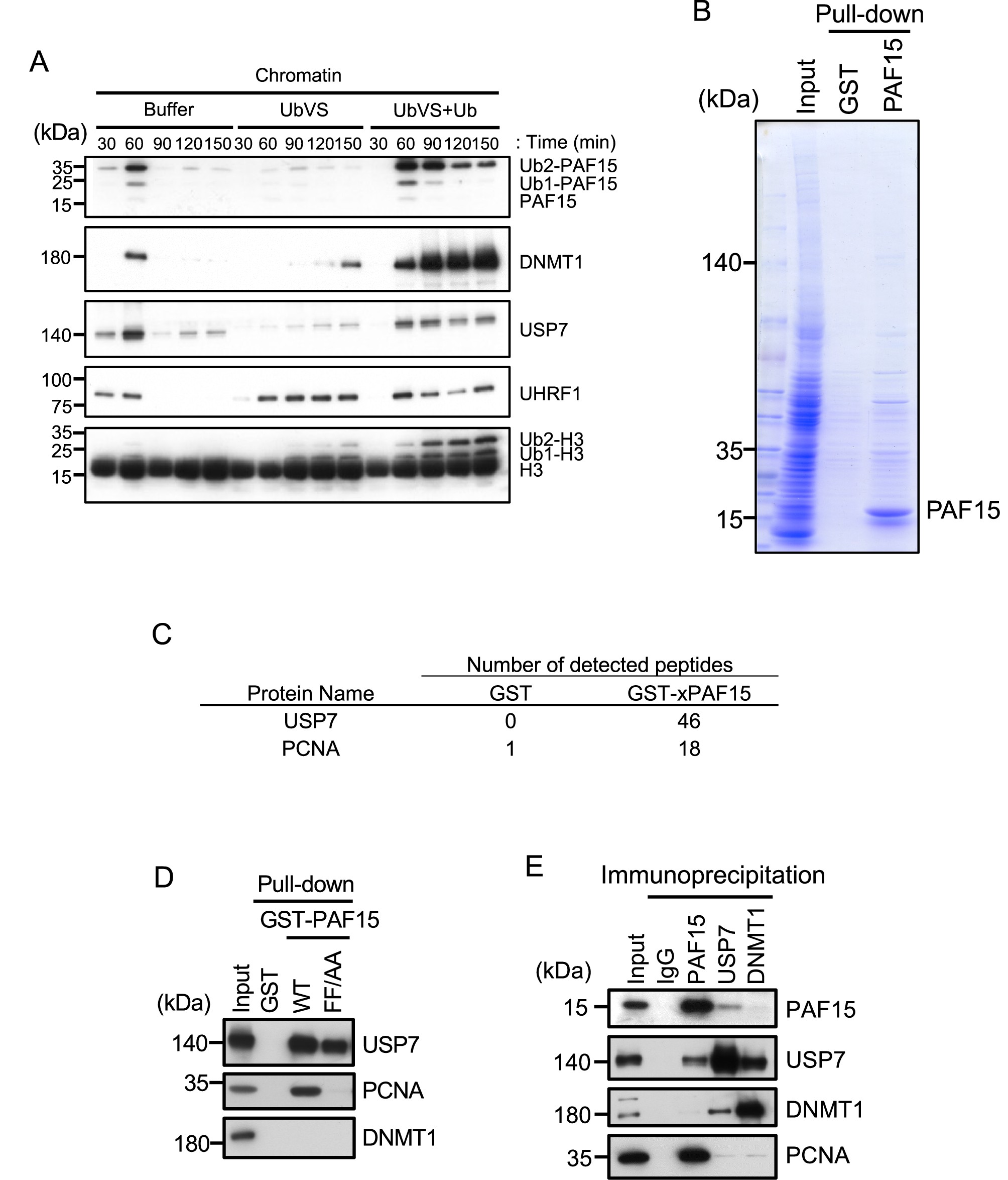 Figure 1. USP7 was identified as a PAF15 binding protein. (A) Sperm chromatin was added to interphase egg extracts supplemented with either buffer (+Buffer), 20 µM UbVS (+UbVS), or 20 µM UbVS and 58 µM ubiquitin (+UbVS + Ub). Samples were analyzed by immunoblotting using the antibodies indicated. (B) Proteins pull-downed from interphase egg extracts by GST and GST-PAF15 were stained by Coomassie Brilliant Blue. (C) The samples from GST-PAF15 pull down were analyzed by nanoflow liquid chromatography-tandem mass spectrometry (nanoLC-MS/MS). Selected proteins were indicated in the table. (D) GST pull-down assay was performed by GST or GST-PAF15 wild-type (WT) or PIP mutant (FF/AA), and the samples were analyzed by immunoblotting using the antibodies indicated. (E) Immunoprecipitation was performed by PAF15, USP7, and DNMT1 antibodies-bound beads, and the samples were analyzed by immunoblotting using the antibodies indicated. Source data are provided as Figure 1—source data 1. |