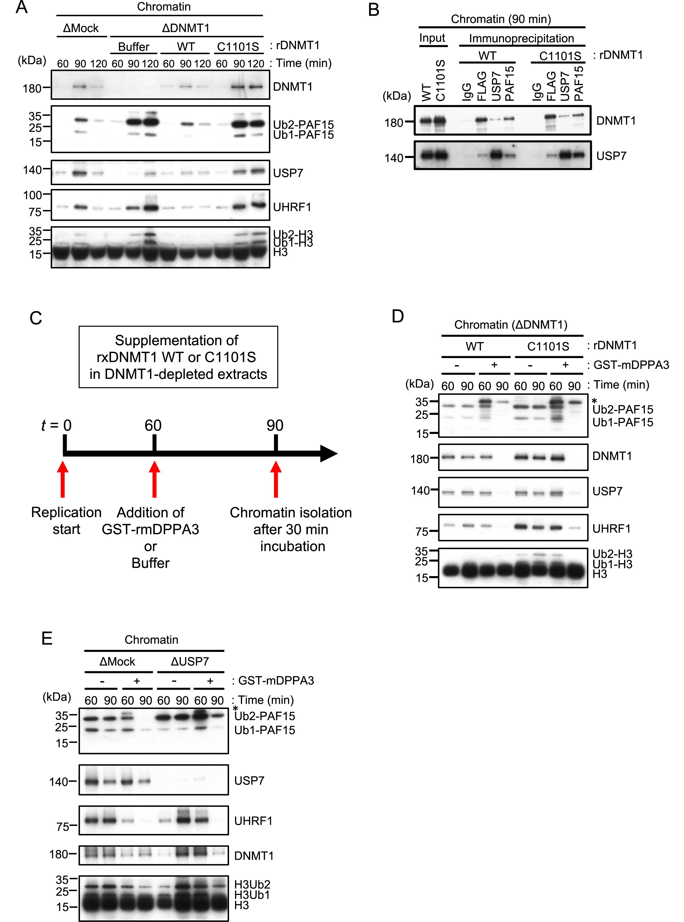 Figure 5. Unloading of PAF15 requires DNMT1-dependent DNA methylation. (A) Sperm chromatin was added to Mock- or DNMT1-depleted interphase extracts supplemented with either buffer (+Buffer), wild-type rDNMT1-3xFLAG (+WT), or catalytic mutant rDNMT1 C1101S-3xFLAG (+C1101 S). Chromatin fractions were isolated, and the samples were analyzed by immunoblotting using the antibodies indicated. (B) Sperm chromatin was added to DNMT1-depleted interphase extracts supplemented wild-type rDNMT1-3xFLAG (+WT) or catalytic mutant rDNMT1 C1101S-3xFLAG (+C1101 S). Replicating chromatin was digested by micrococcal nuclease (MNase). Immunoprecipitation was performed by PAF15, USP7 antibodies-bound beads, and FLAG affinity beads in the solubilized chromatin fraction solution, and the samples were analyzed by immunoblotting using the antibodies indicated. (C) A schema of an experiment described in D. (D) Sperm chromatin was added to DNMT1-depleted interphase extracts supplemented wild-type rDNMT1-3xFLAG (+WT) or catalytic mutant rDNMT1 C1101S-3xFLAG (+C1101 S). After 60 min, the extracts were supplemented with either buffer (−) or GST-mDPPA3 61–150 (+). Chromatin fractions were isolated, and the samples were analyzed by immunoblotting using the antibodies indicated. The asterisk indicates a non-specific band. (E) Sperm chromatin was added to USP7-depleted interphase extracts. After 90 min, the extracts were supplemented with either buffer (−) or GST-mDPPA3 61–150 (+). Chromatin fractions were isolated, and the samples were analyzed by immunoblotting using the antibodies indicated. The asterisk indicates a non-specific band. Source data are provided as Figure 5—source data 1. |