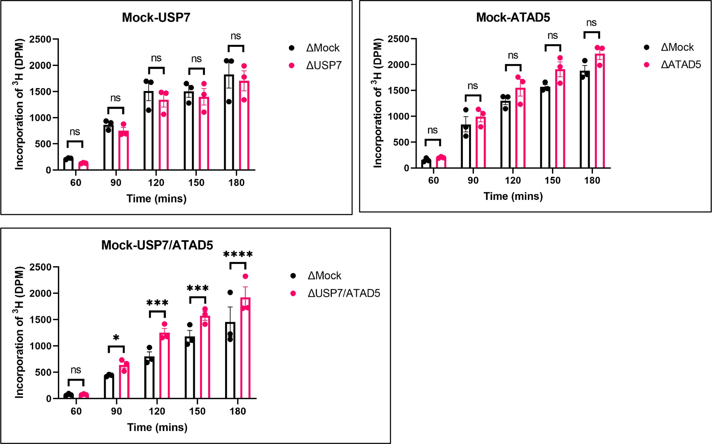Figure 7. PAF15 dissociation negatively regulates aberrant increase of DNA methylation. Sperm chromatin and radiolabeled S-(methyl-3H)-adenosyl-L-methionine were added to either Mock- and USP7-, ATAD5-, or USP7/ATAD5 co-depleted extracts. Purified DNA samples were analyzed to determine the efficiency of DNA methylation. Data are presented as mean ± SEM from three biological replicates. Multiple comparisons were performed by two-way repeated measure ANOVA (RM ANOVA) followed by Sidak’s multiple comparison test. ns; not significant, ∗p<0.05, ∗∗∗p<0.001, and ∗∗∗∗p<0.0001. Source data are provided as Figure 7—source data 1. |