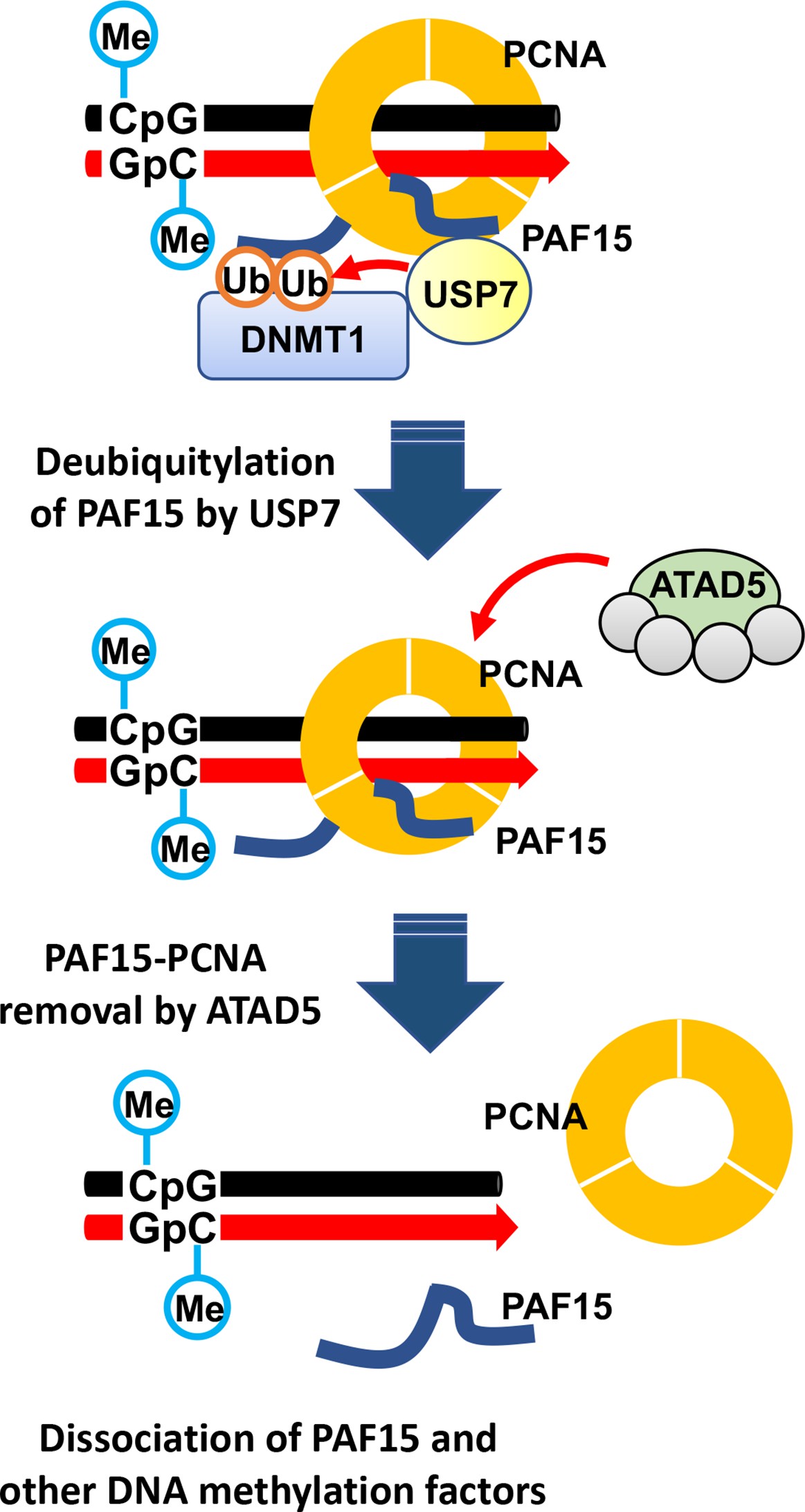 UHRF1-dependent ubiquitin signaling plays an integral role in the regulation of maintenance DNA methylation. UHRF1 catalyzes transient dual mono-ubiquitylation of PAF15 (PAF15Ub2), which regulates the localization and activation of DNMT1 at DNA methylation sites during DNA replication. Although the initiation of UHRF1-mediated PAF15 ubiquitin signaling has been relatively well characterized, the mechanisms underlying its termination and how they are coordinated with the completion of maintenance DNA methylation have not yet been clarified. This study shows that deubiquitylation by USP7 and unloading by ATAD5 (ELG1 in yeast) are pivotal processes for the removal of PAF15 from chromatin. On replicating chromatin, USP7 specifically interacts with PAF15Ub2 in a complex with DNMT1. USP7 depletion or inhibition of the interaction between USP7 and PAF15 results in abnormal accumulation of PAF15Ub2 on chromatin. Furthermore, we also find that the non-ubiquitylated form of PAF15 (PAF15Ub0) is removed from chromatin in an ATAD5-dependent manner. PAF15Ub2 was retained at high levels on chromatin when the catalytic activity of DNMT1 was inhibited, suggesting that the completion of maintenance DNA methylation is essential for the termination of UHRF1-mediated ubiquitin signaling. This finding provides a molecular understanding of how the maintenance DNA methylation machinery is disassembled at the end of the S phase.