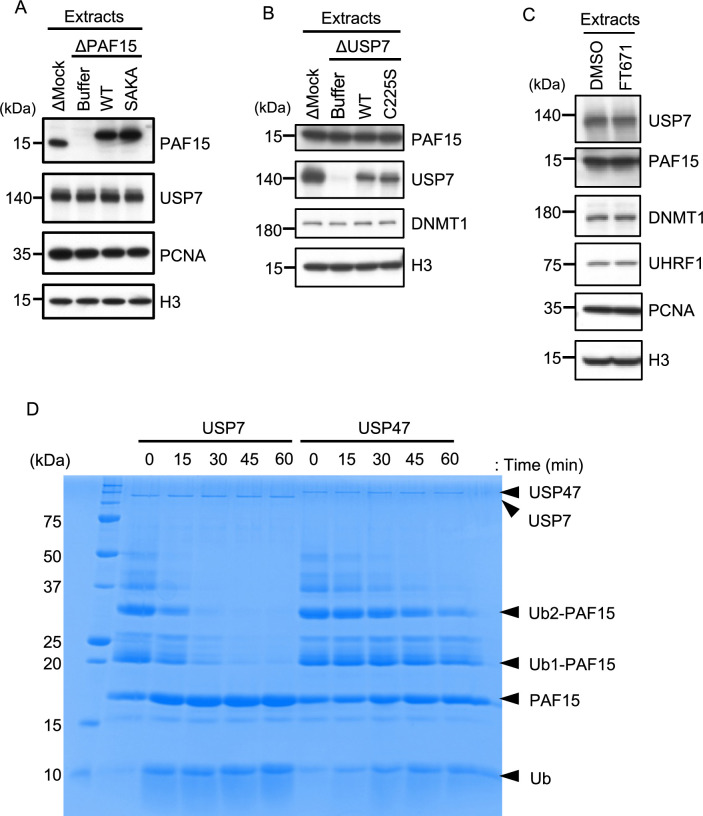 Figure 3—figure supplement 1. USP7 directly deubiquitylates PAF15 to promote PAF15 chromatin dissociation.(A) rPAF15 WT-3xFLAG or SAKA-3xFLAG were added to PAF15-depleted extracts. The extracts used in Figure 3A were analyzed by immunoblotting using the antibodies indicated. (B) rUSP7 WT-3xFLAG or C225S-3xFLAG were added to USP7-depleted extracts. The extracts used in Figure 3B were analyzed by immunoblotting using the antibodies indicated. (C) Interphase egg extracts supplemented with dimethyl sulfoxide (DMSO) or the USP7 inhibitor FT671 used in Figure 3C were analyzed by immunoblotting using the antibodies indicated. (D) Ubiquitinated PAF15 was prepared by in vitro ubiquitylation using E1 (mouse UBA1), E2 (UBE2D3), E3 (UHRF1), ubiquitin, and C-teminal FLAG tagged PAF15. The reaction mixture was boiled, and the precipitant was removed by centrifugation. The supernatant containing ubiquitinated PAF15 was incubated with 50 nM recombinant USP7 or USP47. Incubations were stopped at the indicated time by adding SDS-PAGE loading buffer and analyzed by CBB staining. Source data are provided as Figure 3—figure supplement 1—source data 1. Figure 3—figure supplement 1—source data 1. Figure 3—figure supplement 1 Original blots. |