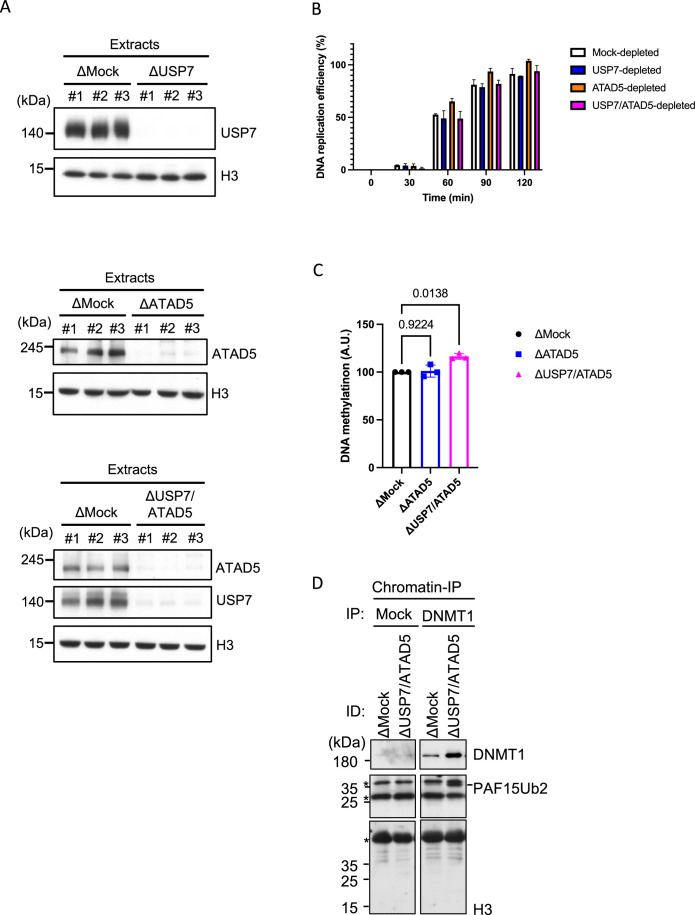 Figure 7-figure supplement 1. DNA replication and methylation analysis in USP7 or ATAD5-depleted extracts. (A) Mock-, USP7-, ATAD5-, or USP7/ATAD5 co-depleted extracts used in Figure 7 were analyzed by immunoblotting using the antibodies indicated. (B) Sperm chromatin and radiolabeled (α-32P) dCTP were added to Mock-, USP7-, ATAD5-, or USP7/ATAD5 co-depleted extracts. Purified DNA samples were analyzed to determine the efficiency of DNA replication. Data are presented as mean ± SEM from three biological replicates. (C) Sperm chromatin and radiolabeled S-(methyl-3H)-adenosyl-L-methionine were added to either Mock-, ATAD5-, or USP7/ATAD5 co-depleted extracts. Purified DNA samples were analyzed to determine the efficiency of DNA methylation. Data are presented as mean ± SEM from three biological replicates. Multiple comparisons were performed by two-way repeated measure ANOVA (RM ANOVA) followed by Sidak’s multiple comparison test. DNA methylation (A.U) was calculated relative to the value of mock-depleted control reactions. (D) Sperm chromatin was added to Mock- or USP7/ATAD5-depleted extracts. Replicating chromatin was isolated and digested by micrococcal nuclease (MNase). Immunoprecipitation was performed by DNMT1 antibodies-bound beads, and the samples were analyzed by immunoblotting using the antibodies indicated. Source data are provided as Figure 7—figure supplement 1—source data 1. |
