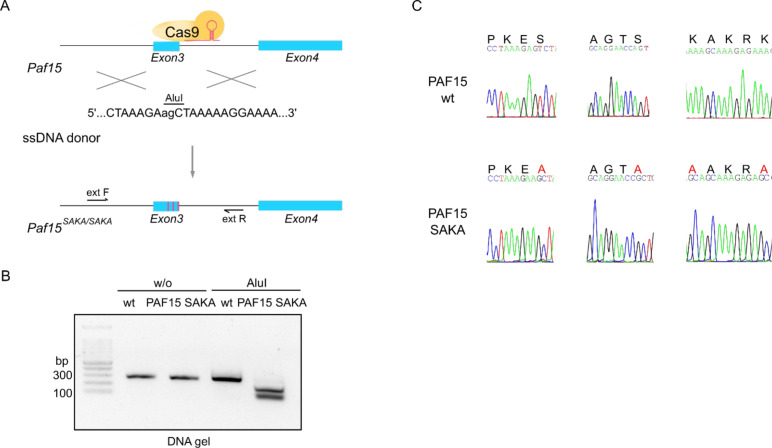 Figure 8-figure supplement 1. Generation and characterization of mouse embryonic stem cell (mESC) lines carrying the SAKA mutants by genome editing. (A) Schematic representation of the CRISPR/Cas9 gene editing strategy. The restriction enzyme recognition site for restriction fragment length polymorphism (RFLP) screening is shown. (B) Genotyping using RFLP analysis of PAF15 SAKA mutant line and digestion by the AluI enzyme. (C) DNA sequencing traces confirming the successful mutations of the SAKA in Paf15. |