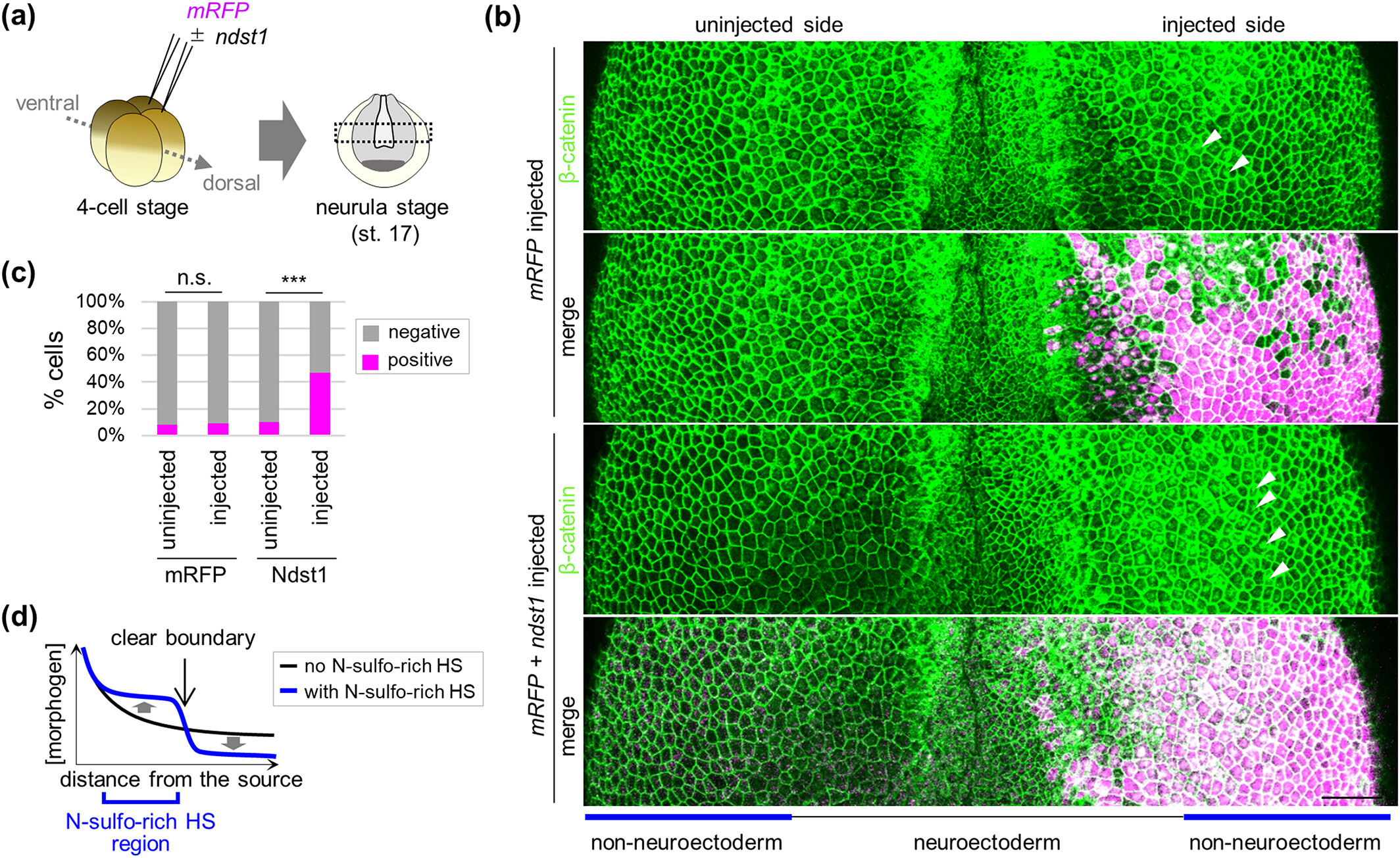 Figure 4. ndst1 overexpression enhances Wnt activity at the neurula stage. (a) Schematic view of the injection. 400 pg mRFP mRNA with/without 25 pg ndst1 mRNA was injected into two blastomeres at the 4-cell stage as indicated. Specimens were fixed at the neurula stage (stage 17). (b and c) Number of cells positive for nuclear β-catenin was increased by ndst1-expression in the non-neuroectodermal region. β-catenin was visualized in the region that indicated by dotted box in (a) using immunohistochemistry against β-catenin (green). Cells injected mRFP mRNA with/without ndst1 mRNA are colored magenta. The neuroectodermal region is the center (black bar). The non-neuroectodermal region is indicated by blue bars. Cells positive/negative for β-catenin were counted in the non-neuroectodermal region (uninjected side vs. injected side of mRFP injected or mRFP + ndst1 injected embryos). Fisher's exact test, p = 0.84 (mRFP; n.s.; n = 172 [uninjected] vs. 143 [injected]), 1.4 × 10−11 (mRFP + Ndst1; ***; n = 131 [uninjected] vs. 130 [injected]). Scale bar = 100 μm. (d) Schematic view of N-sulfo-rich HS function on morphogen distribution.