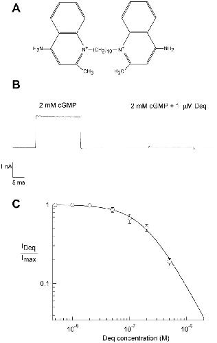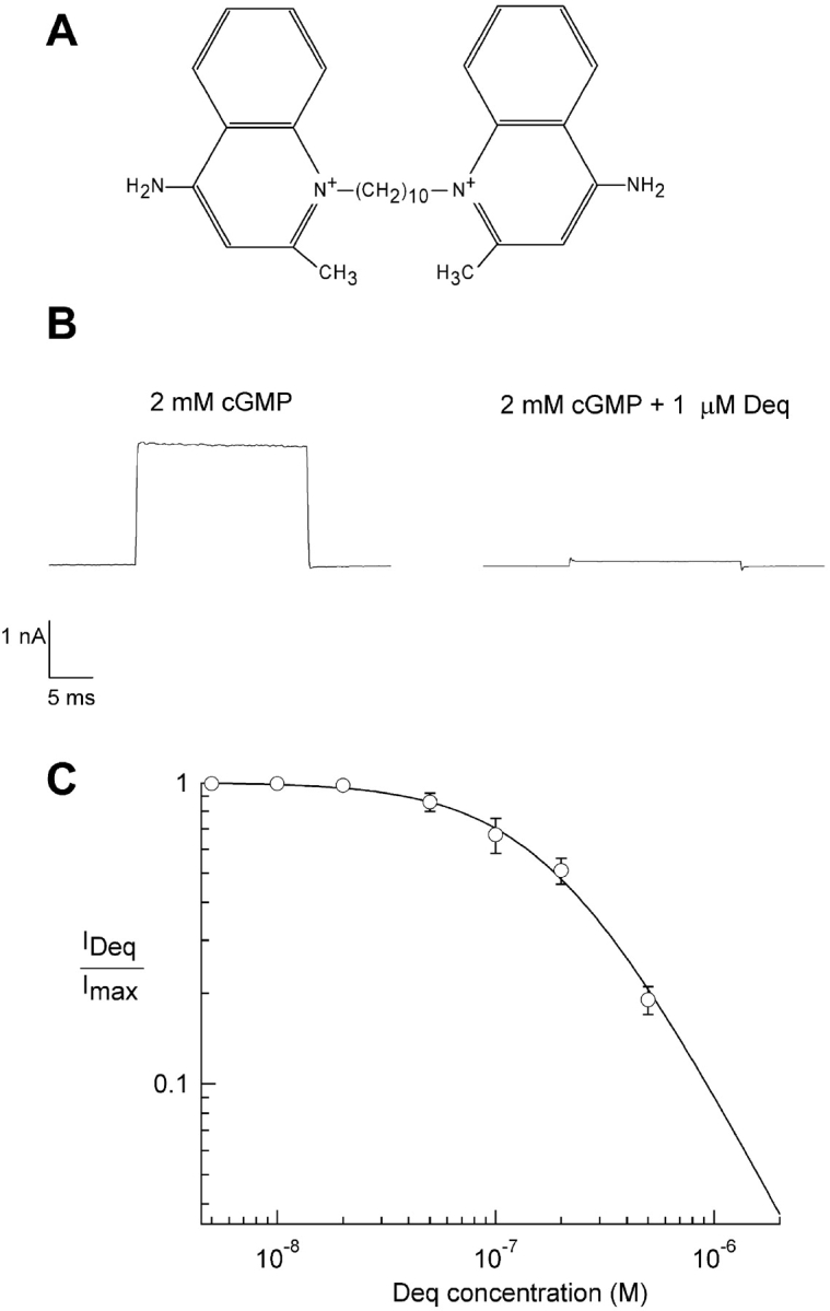 Figure 1. . Dequalinium blocks CNGA1 channels at a saturating cGMP concentration. (A) Chemical structure of dequalinium (quinolinium, 1,1′-(1, 10-decanediyl)bis(4-amino-2-methyl dichloride)). (B, left) Initial current obtained in the presence of 2 mM cGMP. (B, right) Block of current obtained from the same patch in the presence of 1 μM dequalinium. (C) Dose-response relation for dequalinium block. The smooth curve is a fit with the Hill equation (see materials and methods) with K1/2 = 189 nM and the Hill coefficient = 1.4. All currents were measured at 20 mV. Error bars represent SEM; n = 5 patches.
