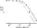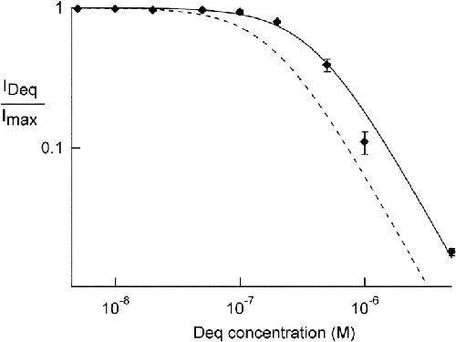 Figure 2. . Dequalinium blocks heteromeric CNGA1+CNGB1 channels. Dose-response relation for block of heteromeric channels by dequalinium. A 1:4 ratio of CNGA1:CNGB1 RNA was injected in oocytes. The dotted curve was taken from the CNGA1 homomeric data shown in Fig. 1 C. Data from heteromeric channels (diamonds) were fit with the Hill equation with the following parameters: K1/2 = 385 nM, Hill coefficient = 1.5.