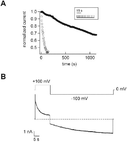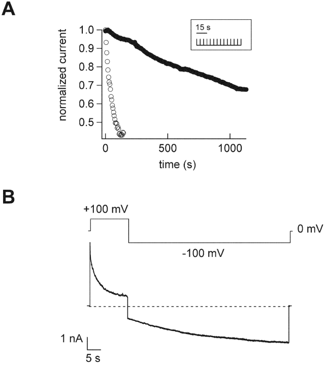 Figure 4. . Dequalinium applied to the extracellular surface appears to block from the inside. (A) Time-course for block by 1 μM dequalinium applied to the intracellular surface of an inside-out patch (open symbols) and 1 μM dequalinium applied to the extracellular surface of an outside-out patch (filled circles). Each time course was fit with a single exponential, with a τ = 53 ms for the inside-out patch and τ = 1,429 ms for the outside-out patch. The inset represents the voltage protocol used for these experiments. (B) Current response to a voltage protocol, as indicated above the data. Here, 1 μM dequalinium was applied to the extracellular surface of an outside out patch. The current decay at 100 mV indicates block and the relaxation at −100 mV represents unblock.