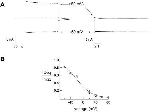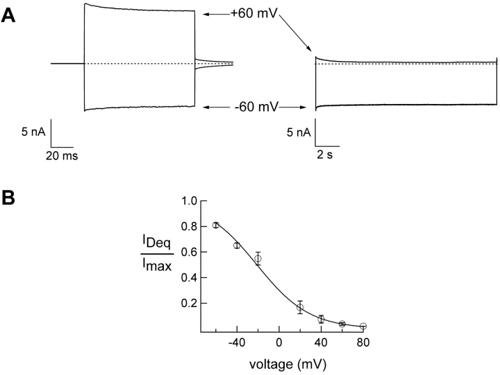 Figure 6. . Voltage dependence of dequalinium block. (A) Current traces obtained at −60 and 60 mV (as indicated by the arrow) in the absence of dequalinium (left) and in the presence of 400 nM dequalinium (right). Dashed line marks the zero current level. (B) Current-voltage relation obtained from holding at the different voltages indicated until steady-state was reached. The smooth curve represents a fit with Eq. 2 with a value of zδ = 1.
