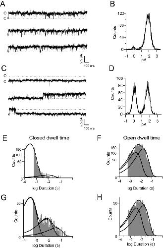 Figure 8. . Single-channel recordings. (A) Single-channel current traces in response to depolarizing voltage pulses to 60 mV in the presence of 2 mM cGMP. Channel open probability = 0.92. Open (O) and closed (C) levels are indicated in the figure. (B) All-points amplitude histogram that corresponds to a current amplitude of 1.9 pA. (C) Current traces from the same channel in A recorded in the presence of 5 nM dequalinium at the same potential. (D) The amplitude histogram shows that the single-channel conductance remains unchanged. (E) The closed distribution for cGMP alone can be fit with sum of two exponentials of time constants 0.34 and 8.4 ms. (F) Open time constant for cGMP alone. The distribution can be fitted with sums of two exponentials with time constants 3.4 and 16 ms. (G) Closed time distribution in the presence of 5 nm dequalinium. In the presence of dequalinium the same time constants are present (0.35 and 7.2 ms), but a third (43.7 ms) appears that corresponds to the blocked state. (H) Open time distribution in the presence of 5 nM dequalinium. The distribution can be fitted with sums to two exponentials (3.4 and 15.6 ms). Similar results were obtained from three other single-channel patches.