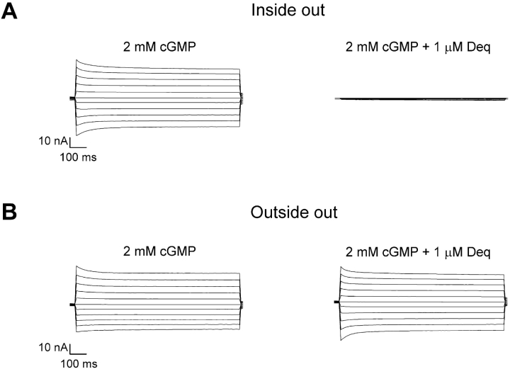 Figure 3. . Block of cGMP-activated currents by dequalinium is more effective from the intracellular side of the channels. (A and B) Current families were recorded in response to voltage steps from 0 mV to between −100 and 100 mV in 20-mV steps. (A) Currents recorded in the inside-out configuration in the absence (left) and presence of 1 μM dequalinium (right). (B) Currents recorded in the outside-out configuration in the absence (left) and presence of 1 μM dequalinium (right).