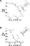 Figure 7. . Interaction of dequalinium with the permeant ion. (A) Dose-response relation for block by dequalinium in 130 mM NaCl (circles) with K1/2 = 189 nM and (B) triangles represent data obtained with 13 mM NaCl with K1/2 = 39 nM (knock-off experiment) and the dotted-line represents data shown in A (see materials and methods). Error bars represent SEM, n = 5.