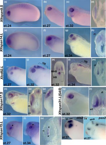 Figure 2. Brain and eye group of tetraspanins. Expression patterns of (a–d) Xltspan9.S, (e–h) Xltspan14.L, and (i–m) Xlcd82.L. The stages are indicated in the figures. (d, h, m, p, r, u) Transverse thick slice. (d) Eye/diencephalon-level section from (c). (h) Eye/mesencephalon-level section from (g). (k) Expression observed in the dorsal top. (m) Eye/diencephalon-level section of (l). Expression was observed in the inner layer of the retina (rt). (n–p) Highly bleached embryo with Xltspan17.S probe at stage 32. (o) Eye/mesencephalon-level expression. (p) Ear-level expression. (q, r) Highly bleached embryo with Xltspan31.L (SAS). (r) Eye/diencephalon-level expression of SAS. (s–u) Xltspan15.L expression patterns. (u) Xltspan15.L was observed in the lens equatorial zone (ls, arrowheads). (v) Xlotx2 expression. (w) Xlpax2 expression. rt, retina; HB, hindbrain; MHB, mid-hindbrain boundary; eb, epibranchial placode; pa, pharyngeal arch; ov, otic vesicle; vrt, ventral retina; di, diencephalon; ls, lens; me, mesencephalon. |