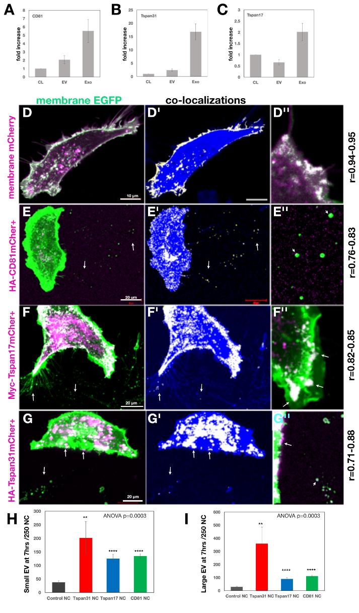Figure S2. Subcellular localization of Tspans. (A) The fold increase of the signal intensity of HA-CD81mCher+ bands detected by anti-HA (16B2) and an HRP-conjugated anti-mouse IgG in Figure 4a. (B) The fold increase of the signal intensity of HA-Tspan31mCher+ bands detected by anti-HA and an HRP-conjugated anti-mouse IgG in Figure 4b. (C) The fold increase of the signal intensity of Myc-Tspan17mCher+ bands detected by anti-Myc (9E10) and an HRP-conjugated anti-mouse IgG in Figure 4c. (D–G″) Co-electroporation of membrane EGFP and Tspan-mCherry fusion constructs or membrane mCherry in MX-1 human breast cancer cell cells. (D–D″) The localization of membrane mCherry was seen in membrane edges around the cell with membrane EGFP. (D) Green and red (magenta) channel image. (D′) Blue indicates cell shape and yellow indicates overlap of EGFP and mCherry. (D″) High magnification. No secretion was seen around the cell. (E–E″) CD81-mCherry fusion protein in MX-1 cells. (E) The intracellular vesicles were not associated with membrane tips. (E′) The co-localization of CD81mCher+ and membrane EGFP was seen in EVs far away from the cell (arrows). (E″) High magnification of EVs. Arrowheads indicate co-localization of CD81mCher+. (F) Tspan17mCher+-overexpressing cell. Arrows indicate Tspan17mCher+ protein in EVs. The number of EVs was increased by overexpression; however, not many EVs were co-localized with Tspan17mCher+. (F″) Membrane ruffles with co-localization of Tspan17mCher+ and membrane EGFP. (G–G″) Tspan31mCher+-overexpressing MX-1 cells. (G) An increase in the number of EVs was seen. (G′) Co-localization was seen in intracellular vesicles, EVs, and membrane edges (arrows). (G″) Arrow indicates co-localization of Tspan31mCher+ with membrane EGFP. Arrowhead indicates EV localization of Tspan31mCher+. (H, I) Statistical analysis of EV numbers around 7 h. (H) The number of small EVs of each sample per 250 NC cells. Statistical differences between samples were analyzed by one-way ANOVA (p = .0003), followed by analyses of individual differences. **p = .001, ****p < .0001. (I) The number of large EVs. The results were similar to the results for small EVs. |