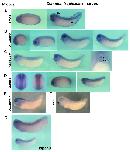 Figure S4. Cross-hybridization of Xenopus laevis probes to Xenopus tropicalis embryos. (A–F) Xenopus tropicalis embryos hybridized with X. laevis Tspan probes. (A) CD9 probe. Expression in the notochord was detected similar to that of Xlcd9. (B) Tspan9 expression. Eye-specific expression was conserved. Expression in somites seemed slightly wider in X. tropicalis. (C) Tspan14 expression. The expression pattern was similar; however, analysis of transverse slices showed that expression was observed in the neural tube (nt) and notochord (nc), and in X. laevis only notochord expression was observed (Figure 1i). (D) CD81 expression. Neurula expression was quite similar to that of Xlcd81. However, in the tailbud or tadpole stage, expression in the pronephric duct was strong, and expression in the ventral vein was observed in X. tropicalis. (E) Tspan17 expression at the tadpole stage was very similar to that in X. laevis. (F) CD63 expression at the tadpole stage was similar to that of Xlcd63 (Figure 3j). However, expression in melanocytes was weak. (G) X. laevis embryos and X. tropicalis embryos were hybridized in the same vial. Staining and bleaching were also done in the same vial. |