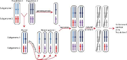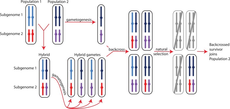 Fig. 1. Homoploid hybridization—gene flow between individuals with the same ploidy level (which in this example are both polyploid individuals)—can lead to differential introgression in subgenomes, either due to random events or in association with natural selection against some admixed genotypes as shown above. The parental populations (populations 1 and 2) are assumed to have two subgenomes with disomic inheritance (indicated with light blue and dark blue or red and purple, respectively, with color differences within each subgenome representing population subdivision). Gametogenesis in a hybrid individual produces gametes with a mosaic of population variation in each subgenome, depicted here as blocks that include entire chromosomes (in reality, recombination would likely generate smaller blocks of population-specific variation within each chromosome). If some backcrossed individuals have low fitness (gray) and high fitness individuals successfully breed in one parental population, different proportions of each subgenome may introgress, here shown as an extreme example of introgression only in subgenome 2.