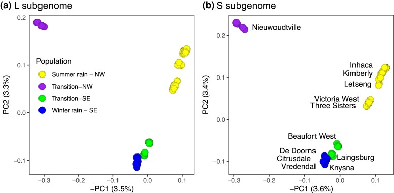 Fig. 3. Principal components analysis of RRGS data from X. laevis for the (a) L and (b) S subgenomes. For each analysis, the percentages of genotypic variation represented by the first and second principal components (PC1 and PC2, respectively) are indicated. Patterns of population structure are similar in each subgenome and samples cluster by rainfall zone (indicated with color in the left panel) and by locality (labeled in right panel).