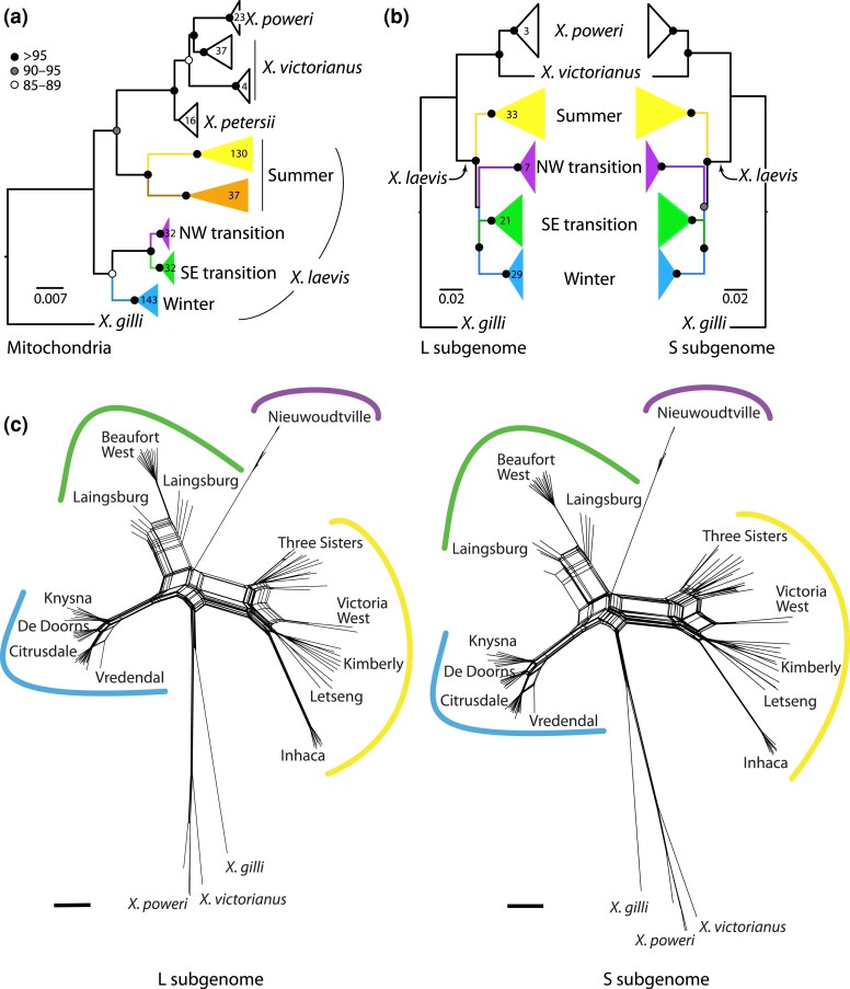 Fig. 5. Evolutionary relationships among mitochondrial sequences (a) are different from (b and c) the L and S subgenomes. In (a) and (b), black, gray, and white nodes indicate bootstrap values as indicated on the scale; numbers inside clades indicate the sample sizes of individuals; samples sizes of the S subgenome (not shown) are identical to those for the L subgenome. The scale bar indicates substitutions per site for the mitochondrial phylogeny; branch lengths of the phenogram are scaled by only variable positions and are not comparable to mitochondrial branch lengths. Samples in each clade of the mitochondrial tree are listed in Supplementary Table 2. Samples with the brown mitochondrial lineage in (a) were not present in the RRGS data (b). In the Neighbor-Net networks in (c), black bars indicate 0.01 substitutions per site for each subgenome.