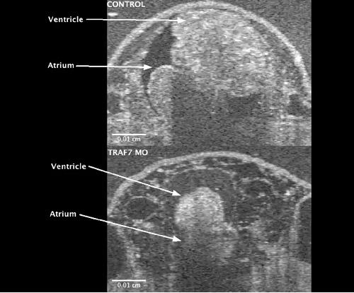 Movie S3. OCT imaging of the Xenopus heart at 3dpf (stage 46) tadpole. Traf7 morphants display defective cardiac contractility and dysplastic hearts with significant pericardial edema. |