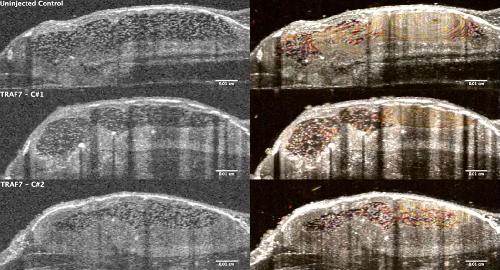 Still from Movie S5. Dorsal-Ventral optical scanning of the stage 46 Xenopus tadpole by OCT imaging shows enlarged, cystic kidney at the TRAF7 depleted side compared to the control-uninjected side. |
