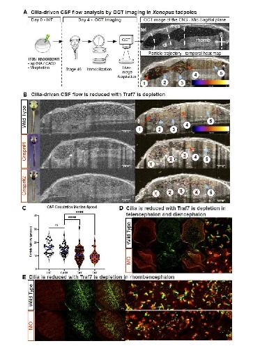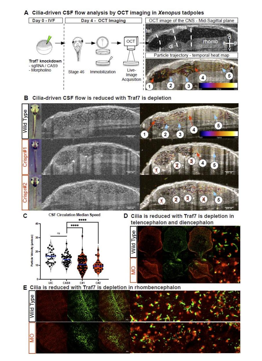 Fig. S9. TRAF7 reduction impairs CSF flow and affects ependymal cilia. A. WT or TRAF-morpholino depleted Stage 45 tadpoles are embedded in 1% low-melt agarose with the dorsal side of the animal facing the OCT beam. 2D and 3D images are taken. Schematic representation of particle tracking enables compartmental CSF flow speed measurements. a Mid-sagittal plane in vivo OCT imaging of a stage 46 tadpole outlining brain structures and ventricular spaces. B. CSF polarity map based on temporally color-coded frames 11000 at the mid-sagittal plane delineates particle trajectories of 5 discrete flow-fields (FFs) (labeled 15). FF1: telencephalic, FF2: diencephalic, FF3: mesencephalic, FF4: anterior rhombencephalic, FF5: posterior 12 rhombencephalic (red: clockwise, blue: counterclockwise). CSF: cerebrospinal fluid; a: anterior, p: posterior, d: dorsal, v: ventral.B,C. Reduction of TRAF7 in vivo affects cilia-driven CSF flow. Median compartmental flow speed. CRISPR knockdown of TRAF7 significantly impacts the flow of CSF in the brain as compared to WT or Cas9 injected embryos. D,E. Reduction of TRAF7 in vivo affects ciliogenesis in the telencephalon, diencephalon and rhombencephalon. Ependymal cilia, which drive the CSF flow, are significantly abrogated in TRAF7 morpholino knockdown embryos as compared to WT embryos. Cilia are stained for Arl13b (green) and -tubulin (red) |
