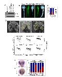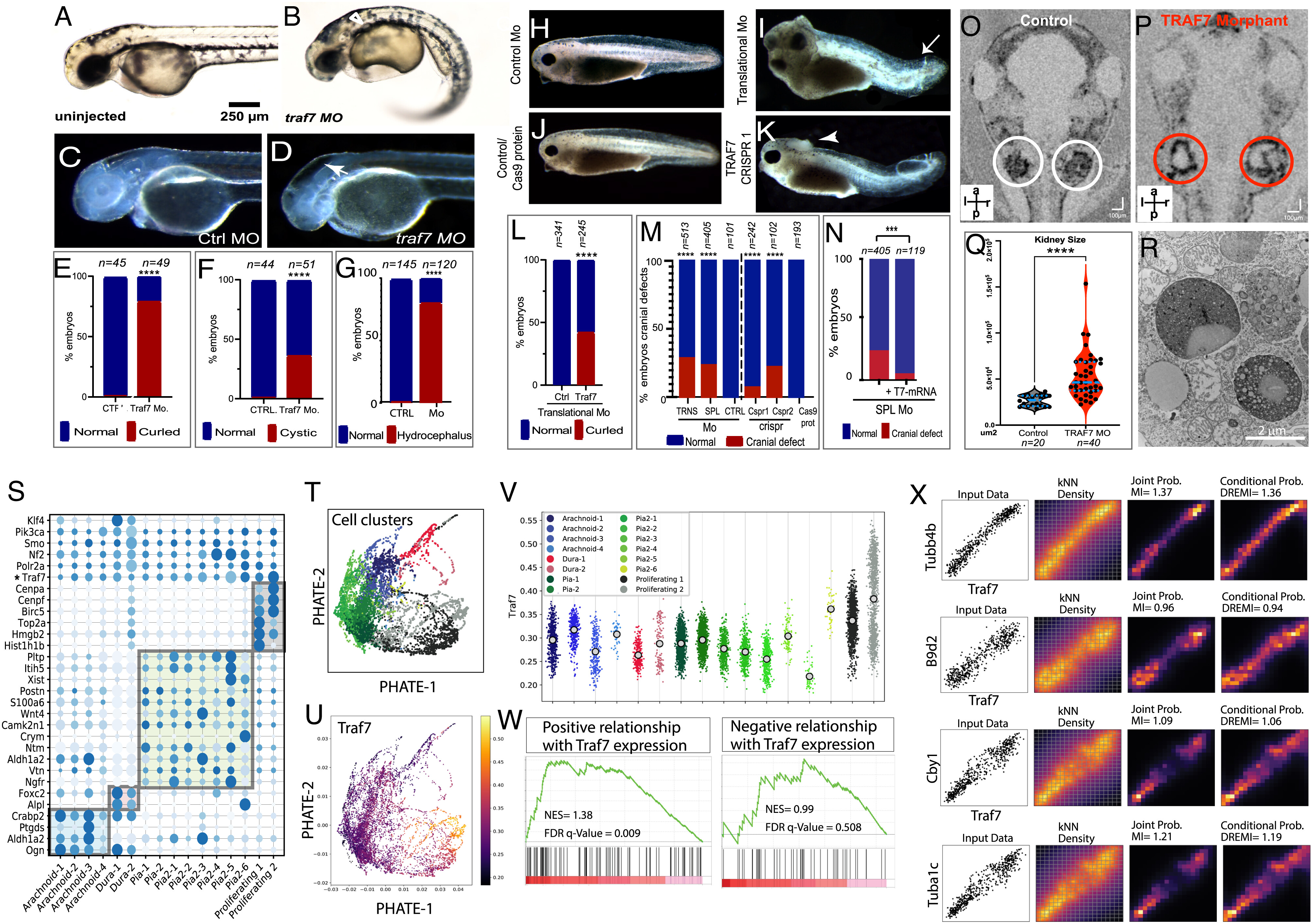 Figure 3. Reduction of TRAF7 causes ciliopathy phenotypes in zebrafish (AG) and Xenopus tropicalis (HR), and single-cell transcriptomic analysis reveals TRAF7 association with cilia-related genes (SV). (A and B) Pronephric cysts and axial curvature in 2.5 dpf Traf7 morphant zebrafish larva (A) but not control. (B). Embryos exhibit substantial ventrally directed curling and cysts that appear as small spherical clearings in the pronephros (arrowhead). (C and D) Hydrocephalus in 2 dpf embryos following injection of TRAF7 splice-site (R), but not control (Q), MO at the 1-cell stage. Quantification of embryos presenting with hydrocephalus (S) ****: P < 0.0001 (two-sided Fishers exact test, n= # of embryos). (E) Quantification of curled-down phenotype. This occurs in ~75% of MO-injected embryos, but never in controls. ****: P < 0.0001 (two-sided Fishers exact test, n= # of embryos). (F) Quantification of cystic phenotype. This appears in ~33% of MO-injected embryos, but never in controls. ****: P < 0.0001 (two-sided Fishers exact test, n= # of embryos). (G) Quantification of hydrocephalus phenotype. This appears ~75% of the time in injected fish, but never in uninjected controls. ****: P < 0.0001 (two-sided Fishers exact test, n= # of embryos). ( HN) Hydrocephalus and cranial (arrowheads) and tail (arrows) defects in 2 dpf (stage 38-39) in X. tropicalis embryos injected with translational (I) but not control (H) MO, or with CRISPR/Cas9 targeting TRAF7 (K), but not Cas9 alone (J). Scale bar: 200 m. (L) Quantification of curled tail phenotype. This appears in ~47% of MO-injected embryos, but never in controls. ****: P < 0.0001 (two-sided Fishers exact test, n = # of embryos); (M) Quantification of hydrocephalus/cranial defect phenotype. This appears in embryos injected with translational morpholino (~30%) and splice-site morpholino (~25%), but never in embryos injected with control morpholino. CRISPR2 injections are more effective (~25%) than CRISPR 1 (~12%) as compared to CAS9 in eliciting cranial defect phenotype. ****: P < 0.0001 (two-sided Fishers exact test, n= # of embryos); (N) Rescue of cranial defects upon coinjection of 100 pg of WT-TRAF7 mRNA and splice-site TRAF7-MO. n = number of embryos. ***: P < 0.001 (two-sided Fishers exact test, n = # of embryos). (OR) Traf7 morphant (P) but not control (O) X. tropicalis embryos exhibit enlarged kidneys at 5 dpf as visualized by OCT; (Q) Quantification of kidney size: TRAF7 morphant embryos show a variable but overall significant increase in kidney size as compared to control embryos (Movie S5). ****: P < 0.0001 (two-sided Fishers exact test, n= # of embryos); ( R) Transmission electron microscopic analysis of the developing pronephros at 5 dpf shows large vesicular bodies suggestive of precystic kidneys. (SX) scRNAseq analysis of E14.5 mouse meninges obtained from publicly available data (25). Dot plot showing mean expression for marker genes for the arachnoid, dura, pia, and proliferating cell clusters. The size and color density of the dots represent fraction of cells expressing the gene in the groups and mean expression, respectively. Shaded rectangles indicate genes enriched in cell clusters. * Indicating the relative expression of Traf7 within cell clusters (S). PHATE plot showing different cell clusters in scRNAseq data in (S). Colors representing cell clusters [see panel V] (T). PHATE plot demonstrating Traf7 expression profile in mouse meningeal cell clusters (U). Jitter plot showing enrichment of Traf7 in proliferating meningeal cluster, more prominently in Proliferating-2 subcluster (V). Gene set enrichment analysis (GSEA) indicating the enrichment of cilia-related genes (obtained from CiliaCarta Database) within the genes that show positive (Left) or negative (Right) association with Traf7 expression in knn-DREMI analysis. Positively associated genes demonstrating significant enrichment for cilia-related genes, while negatively associated genes do not. NES: Normalized enrichment score (W). Representative DREVI plots for the cilia-related genes showing strong positive relationship with Traf7 expression in knn-DREMI analysis (X). |