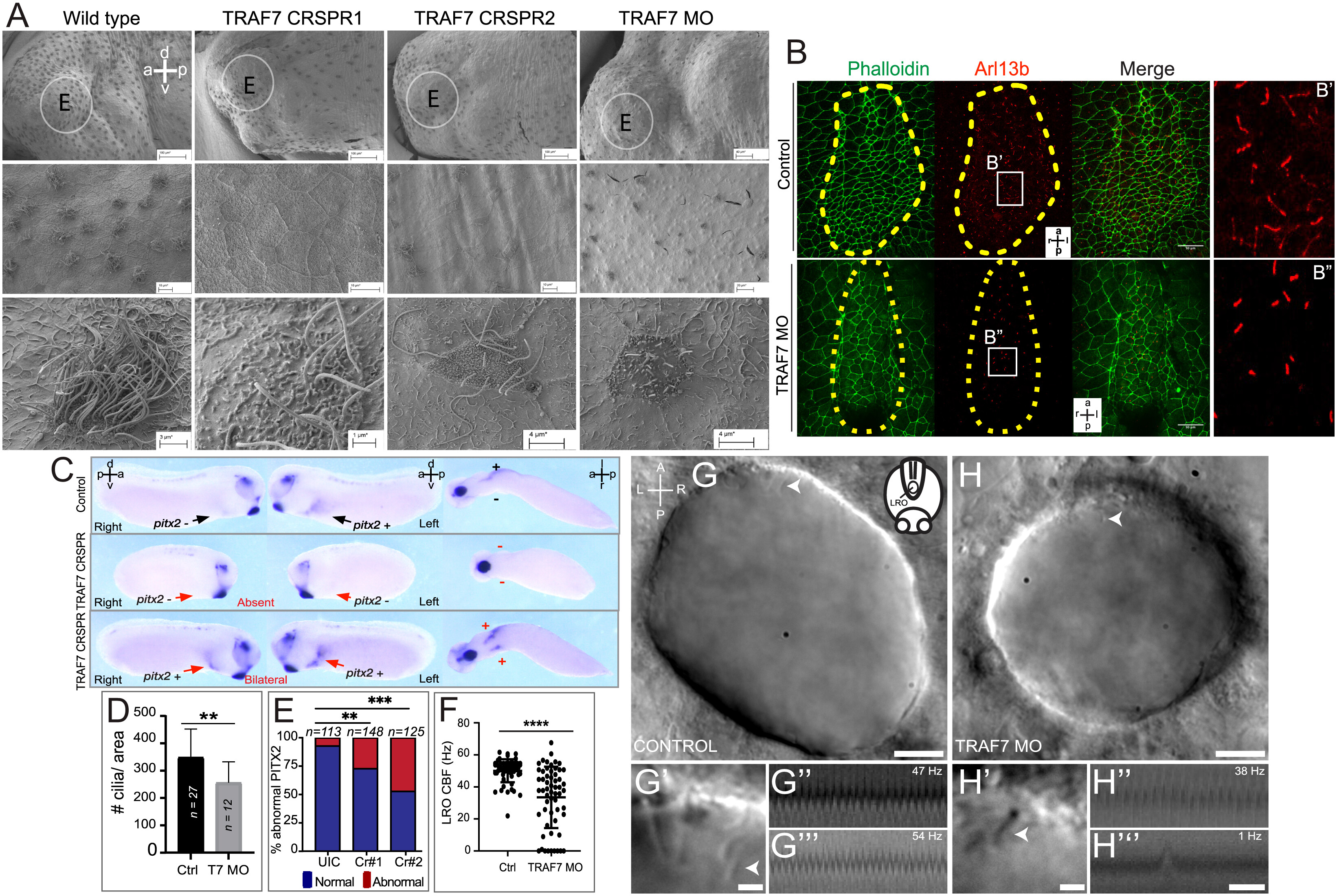 Figure 5. TRAF7 knockdown in Xenopus tropicalis (A–G) and zebrafish (H–J’’’) affects mono- and multi-cilia in the left–right organizer (LRO). (A) Scanning electron microscopic images of Xenopus epidermis reveal defective cilia formation on TRAF7 depletion with either CRISPR #1, #2, or MO. Circled areas are magnified in the bottom panels. (Scale bars: Top row: 100 µm, middle row: 10 µm, bottom row: 3 µm.) (B) Xenopus embryos were injected at 1-cell stage and dorsal explants were prepared at stage 17 to visualize the left–right organizer (LRO). Specimens were processed for immunohistochemistry (IHC) to assess ciliation rate and cell surface area. Compared to uninjected controls, TRAF7 morphants have fewer cilia, as shown by acetylated tubulin (red) and phalloidin (actin, to outline cell boundaries; green). a = anterior, l = left, p = posterior, r = right. C. Analysis of pitx2c expression in stage 28 to 30 Xenopus embryos. Embryos are viewed laterally from the right (first column), the left (second column), and ventrally (third column). Expression of pitx2c is normally in the left lateral plate mesoderm (LPM, black arrow). CRISPR-mediated TRAF7 knockdown results in abnormal absent pitx2c expression with no pitx2c mRNA found in the left or right LPM (Middle panel, red arrows); or abnormal bilateral pitx2c expression with pitx2c mRNA found in both left and right LPM (Bottom panel, red arrows). (D) Bar plot demonstrating quantification of ciliation in relation to cell surface area in the LRO of TRAF7 morphant and control X. tropicalis embryos in (C). **: P < 0.00: t test with Welch correction, n= # of embryos. E. Quantification of pitx2c expression in uninjected controls (UICs) and traf7-G0 mutants by sgRNA#1 and #2. Abnormal includes absent and bilateral pitx2c expression. Statistical calculations were performed using a Chi-square test comparing the number of affected embryos against the number of wild-type embryos. **P < 0.01, ***P < 0.001; n, number of analyzed tadpoles. (F–H). TRAF7 is required for proper motility of cilia in zebrafish LRO. (F) Quantification of the ciliary beating frequency (CBF) in control (60 cilia from eight embryos) and TRAF7 morphants (58 cilia from eight embryos). Mean control CBF= 50.5 Hz ± 7.14. Mean TRAF7 CBF = 33.47 ± 19.15. Two-sample t tests, P = 6.5 × 10−9; mean ± SD. Representative images of the LRO cilia of a control MO-injected embryo (eight somite stage) (G and G’) and of a TRAF7 MO-injected embryo (six somite stage) (H and H’) (Movies S7 and S8). (Scale bars: G, H = 10 µm; G’, H’ = 2 µm.) White arrows indicate cilia. G’ and H’ are close-ups of the imaged regions in the anterior side of the LRO in G and H (Movies S9–S12). Representative kymographs of two individual “control” cilia (G” and G’’’) and of TRAF7 knockdown cilia (H’’ and H’’’). Kymograph total duration 500 ms. (Scale bar, 100 ms.) Movie S6. |