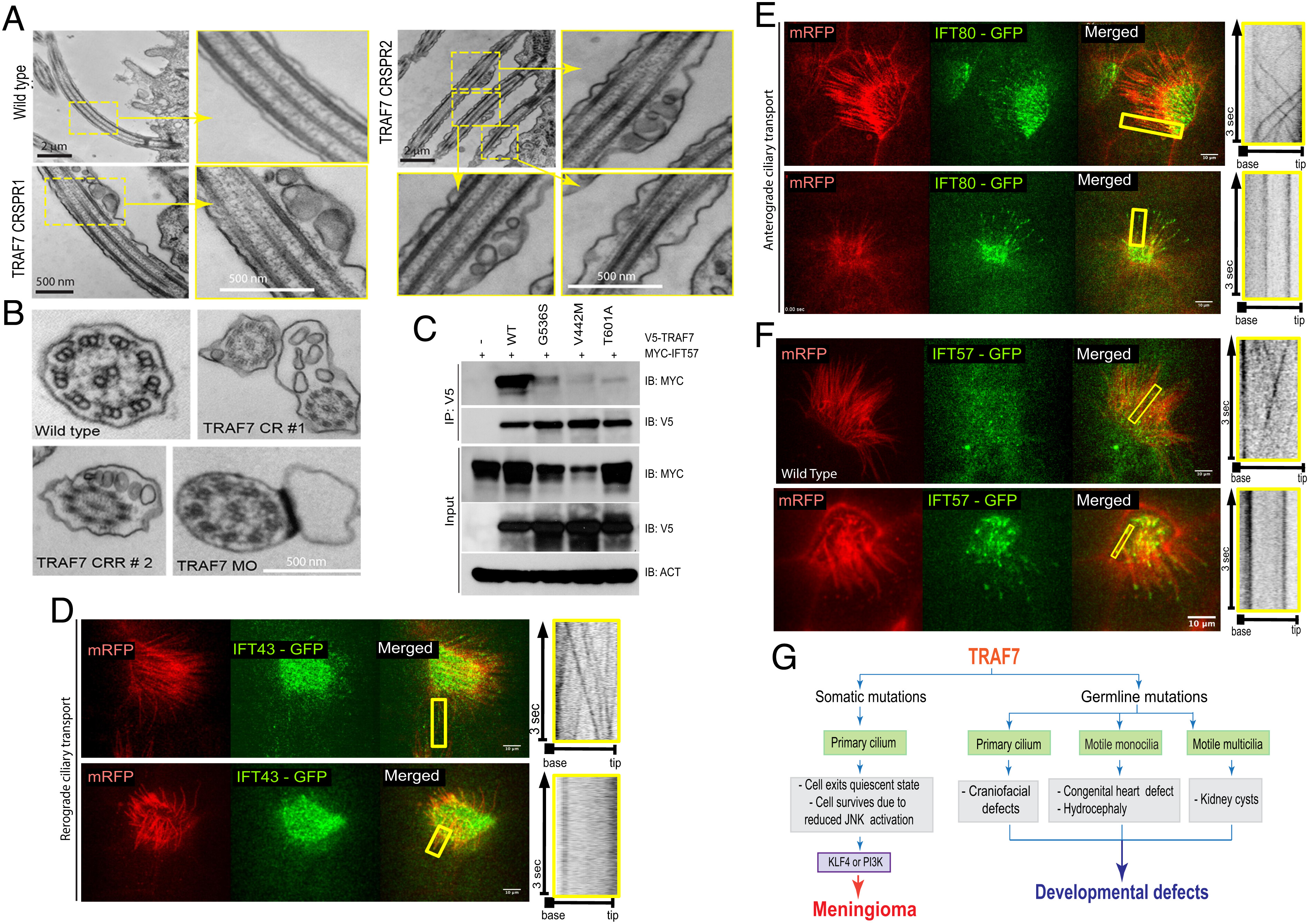 Figure 6. TRAF7 interacts with IFT57, and its knockdown in X. tropicalis impairs intraflagellar transport. (A and B). TEM micrographs of cilia from the pronephros of WT- and TRAF7-morphant Xenopus embryos at 5 dpf. Low- and high (yellow boxes)-magnification views of flat-embedded sections of longitudinally sectioned cilia show frequent blebbing only in TRAF7 morphant samples. Cross-sections of cilia from WT and morphant embryos show the “9 + 2” microtubule doublet configuration with the presence of dynein arms. Sections of cilia in TRAF7 morphant embryos show frequent blebs containing electron-dense material. (C and D). In vivo imaging of IFT dynamics in Xenopus multiciliated cells. Still frames from a video of IFT43-GFP (C) and IFT80-GFP (D) to track intraflagellar transport in a multiciliated cell (Movies S14–16). Cilia are colabeled with mRFP. The yellow box indicates the cilia shown in the right kymograph, depicting still frames from a time-lapse video showing movement of a single control cilium. Time is indicated in seconds. (Scale bars, 10 µm.) (E) Meningioma and CHD- and craniofacial defect-associated TRAF7 mutants (G536S, V442M, and T601A, respectively) show reduced interaction with IFT57. Coimmunoprecipitation analysis in HEK293 cells. (F) In vivo imaging of IFT dynamics in Xenopus multiciliated cells. Still frames from a video of IFT57-GFP to track intraflagellar transport in a multiciliated cell (Movies S17 and S18). Cilia are colabeled with mRFP. The yellow box indicates the cilia shown in the right kymograph, depicting still frames from a time-lapse video showing movement of a single control cilium. Time is indicated in seconds. (Scale bars, 10 µm.) (G) TRAF7 mutations disrupt ciliogenesis resulting in developmental (congenital heart and craniofacial) defects and disease (anterior skull-base meningioma). |