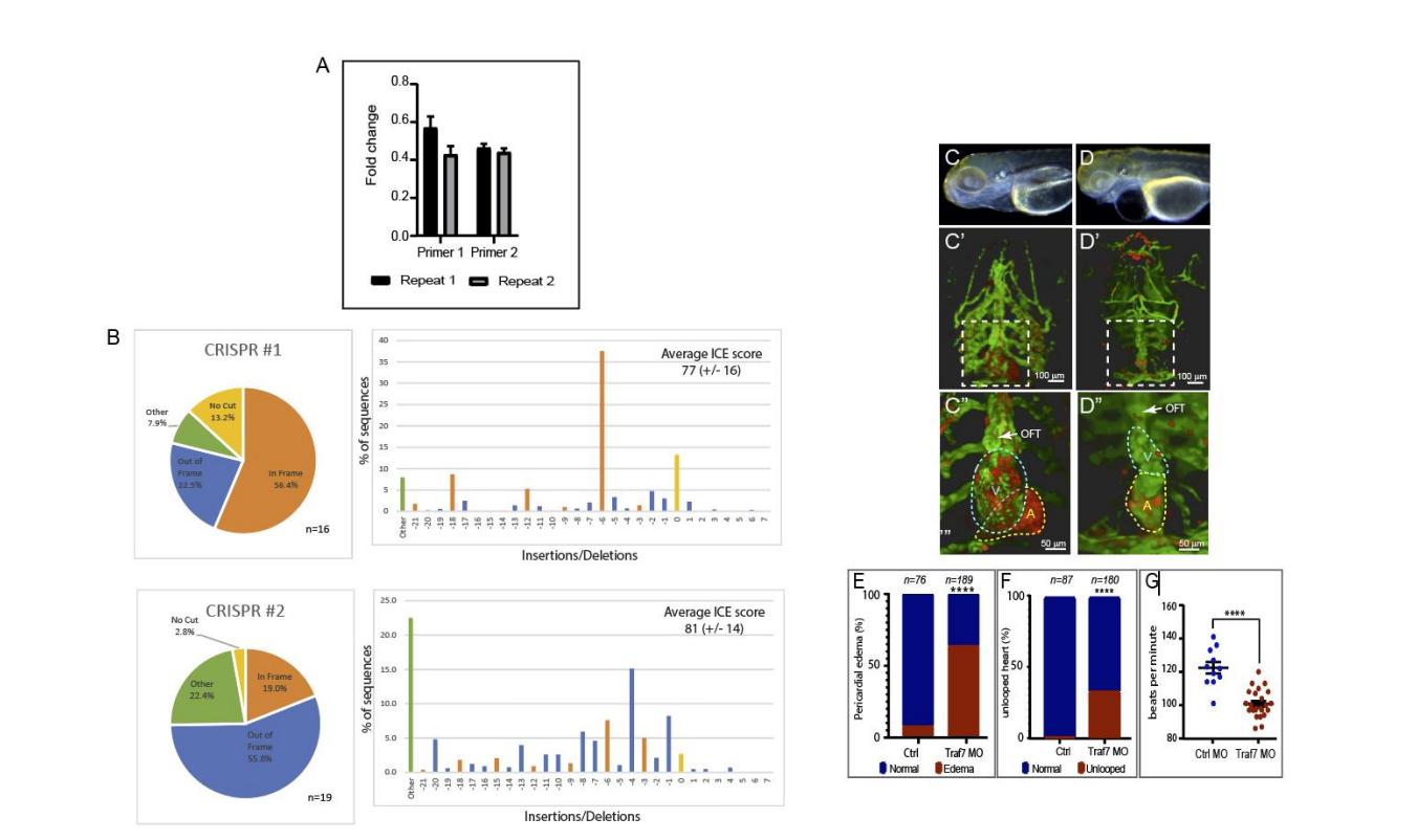 Fig. S4. Efficiency of TRAF7 knockdown in zebrafish and Xenopus; reduction of TRAF7 causes pericardial edema and developmental heart defects in zebrafish. A. qPCR to assess knockdown of TRAF7 by splice-site MO in zebrafish. Two independent replicate experiments with 2 separate primer sets indicate marked reduction in TRAF7 mRNA. B. Graphs showing proportions of in-frame and out of frame indel contributions, and percent contributions of indel lengths for CRISPR #1 and CRISPR #2. ICE (Inference of CRISPR Edits, Synthego) scores were 77 (+/-16) and 81 (+/-14) for CRISPR#1 and #2 respectively, indicating the CRISPR/CAS9 cutting efficiency at the proper site. C-D. Injection of splice-site (D), but not control (C), MO in 1-cell stage embryos results in severe pericardial edema (asterisk) at 4 dpf. Injection of control (C-C) or splice-site (D-D) TRAF7 MO in tg(kdrl:GFP;gata-1:dsRed) embryos results in pronounced heart looping defects, visualized by light-sheet microscopy at 4 dpf. OFT: outflow tract, A: Atrium, V: ventricle, Green: endothelial cells, Red: erythrocytes. Dashed boxes indicate magnified area (shown in C, D). Scale bars: C, D: 100 M; C, D: 50 M. (Movie S1, S2). E, F. Quantification of embryos displaying pericardial edema or cardiac looping ****: p<0.0001 (Fishers exact test; n= # of embryos).G. Assessment of heart abnormality by number of heart beats per minute ****: p<0.0001 (Scatter plot Mean + SEM; t-test with Welchs correction; n=11, CTRL MO injected; n=24, TRAF MO injected). |
