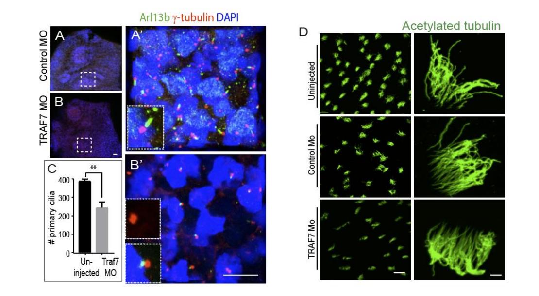 S8. TRAF7 knockdown in Xenopus tropicalis (A-G) affects mono- and multiciliated cells R eduction of TRAF7 in vivo abrogates primary cilia. Xenopus embryos injected with either control (A, A) or TRAF7 (B, B) morpholino (MO) at the 1-cell stage were stained for Arl13b and -tubulin at 1dpf. A, B: 2.5X image of embryo head, dashed boxes shows region highlighted in A and B. A, B: single-plane image, scale bar: 5 m. All images captured under identical confocal settings. Dashed inset boxes show higher magnification of the primary cilium. (C) Unilateral injection of splice-site TRAF7 MO in 2-cell stage embryos results in reduction of number of cells harboring a primary cilium detected by Arl13b and -tubulin at stage 16-18 (15 hpf) when comparing the two halves. Identical z-stacks on equivalent sides of the cephalic fold were imaged by confocal microscopy and 3D projections used for quantification. **: p<0.001 (unpaired t-test with Welchs correction).D. Reduction of TRAF7 in vivo affects motile cilia. Xenopus epidermis (uninjected or injected with either control or TRAF7 MO at the 1-cell stage) were stained with acetylated tubulin at 1 dpf. TRAF7 morphant embryos display reduced motile multicilia. Scale bar: 10 m. |