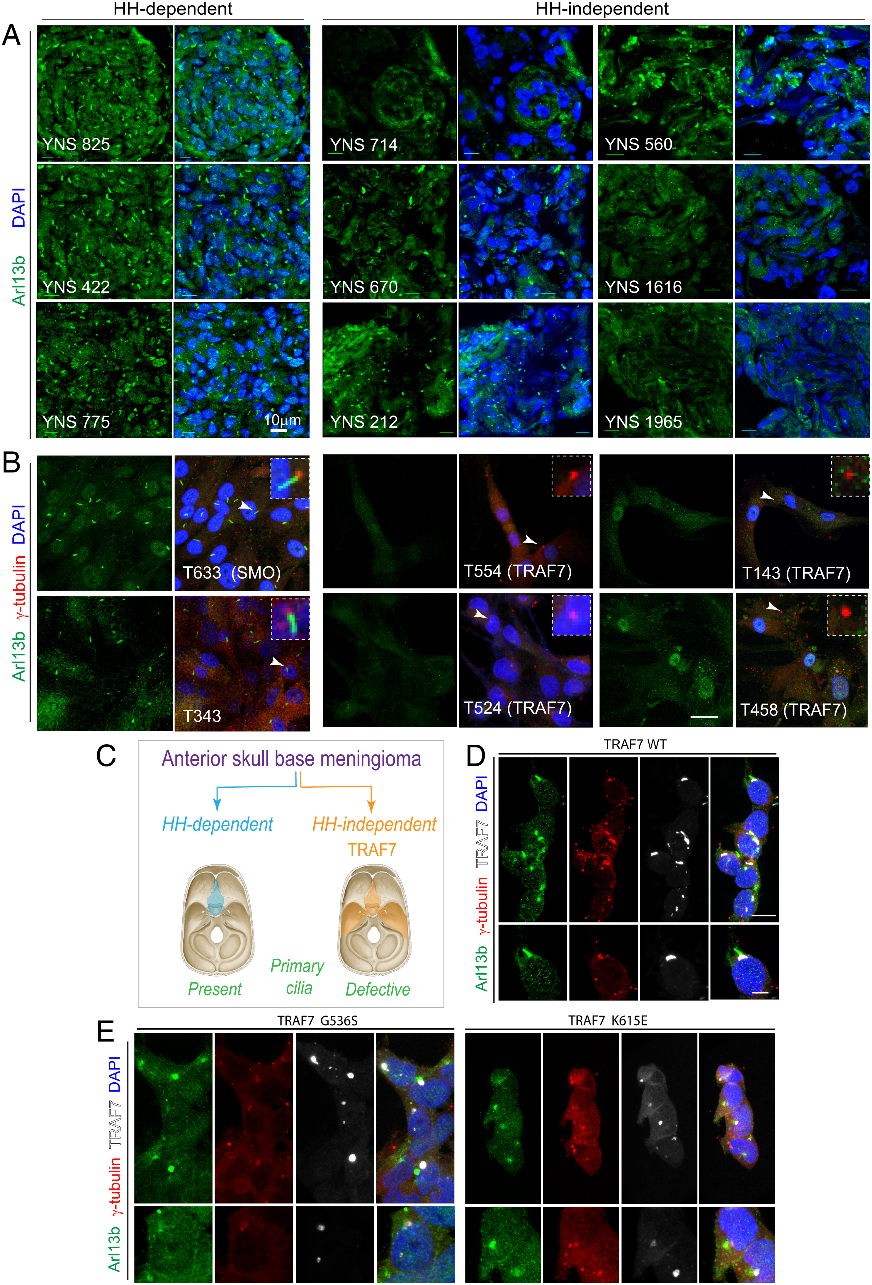 Fig. 4. Loss of primary cilia in TRAF7-driven meningiomas. (A) Meningiomas that are either HH-dependent or -independent [based on microarray analysis, (31)] stained for Arl13b (primary cilia) and DNA (DAPI). Confocal immunofluorescence microscopy reveals that HH-dependent tumors express primary cilia, while HH-independent (TRAF7 mutated) tumors display reduced, abrogated, or absence of primary cilia. Genotypes of tumors used YNS 825: SMO L412F; YNS 422 and YNS 775: HH-driven based on gene expression analysis, mutation unknown; YNS 714: TRAF7 unknown mutation/KLF4 K409Q; YNS 670: TRAF7 K498E/KLF4 K409Q; YNS 212: TRAF7 splice-site mutation: c.1135+5G>A/ AKT E17K; YNS 560: AKT1-E17K (± TRAF7); YNS 1616: TRAF7 I368N/KLF4 K409Q; YNS 1965: TRAF7: R653Q/AKT1-E17K. 3D projections of equivalent z-stacks are shown. (Scale bar, 10 μm.) (B) Primary cultures of meningiomas that are either HH-dependent or -independent [based on microarray analysis, (31)] stained for Arl13b (primary cilia) and γ-tubulin (centrosomes, marking base of cilia). Arrowheads indicate region shown at higher magnification in inset. All images captured under identical confocal settings. [Genotypes of cultures used T633 (derived from YNS 825): SMO L412F; T343 (derived from YNS 422) and T596 (derived from YNS 775): HH driven based on gene expression analysis, mutation unknown; T554 (derived from YNS 714): TRAF7 unknown mutation/KLF4 K409Q; T524 (derived from YNS 670): TRAF7 K498E/KLF4 K409Q; T143 (derived from YNS 212): TRAF7 splice-site mutation: c.1135+5G>A/ AKT E17K); T458 (derived from YNS 560): AKT1-E17K (±TRAF7). (Scale bar: 20 μm.) (C) Schematic representation of anatomic localization of HH-dependent (turquoise) and -independent (orange) meningiomas, driver mutations, and primary cilium status. (D–E) Overexpression of V5-tagged WT and mutant (G536S or K615E) TRAF7 in HEK293 cells followed by staining for Arl13b (green), γ-tubulin (red), and V5 (white, marking TRAF7). Only mutant forms of TRAF7 affect the primary cilium. (Scale bar: 20 μm.) |