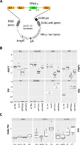 A TP63γ minigene recapitulates the PTBP1-dependent regulation of exon γ inclusion. A, Structure of the TP63 minigene stably transfected in HaCaT cells. β-globin gene sequences are shown in orange, TP63 gene sequences are shown in green. B, qRT-PCR quantification of PTBP1, and the RNA isoforms produced from the TP63 minigene after siRNA-mediated PTBP1 depletion. C, Delta PSI are computed as the fold difference between test and siCTRL as the reference condition. In all panels, n = 6; *, P < 0.05; **, P < 0.01; ***, P < 0.001; Dunnett test.