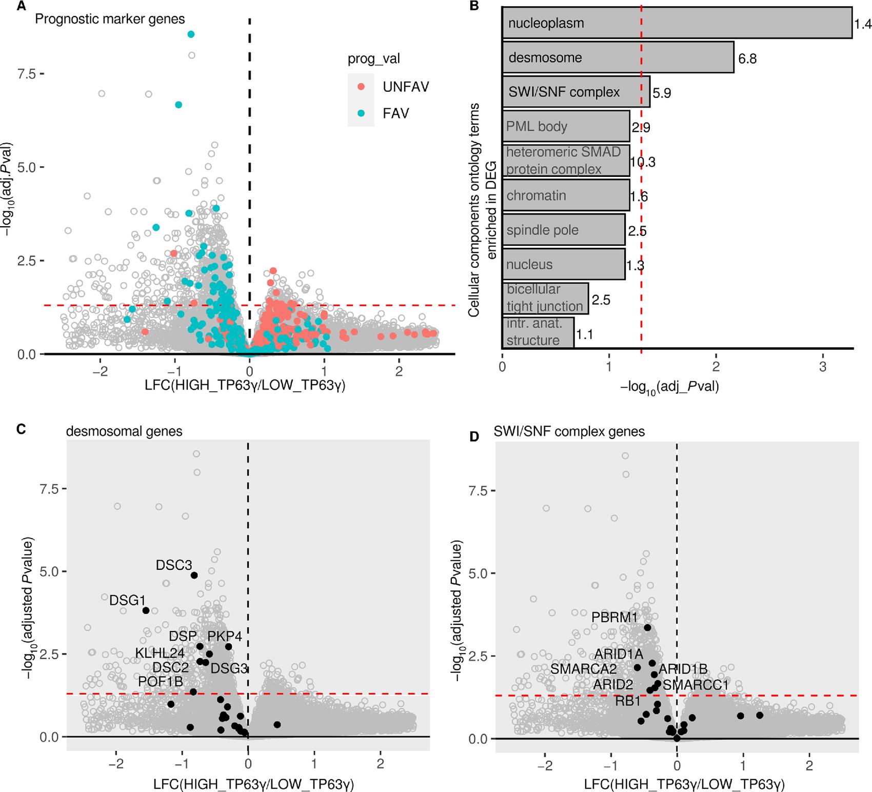 DEG and GO enrichment analysis of patients tumors with high TP63 expression. A, Volcano plot of gene expression in the groups of patients with a high or a low percentage of TP63 isoform. The red dashed lines represent the threshold at BenjaminiHoschberg adjusted P value <0.05. The favorable and unfavorable prognosis marker genes are highlighted blue and red, respectively. B, GO term enrichment analysis performed on DEGs (Padjusted < 0.05) shown in A, the enrichment (observed/expected) is shown on top of the bar. C, Same as A with desmosomal gene highlighted in black. D, Same as A with SWI/SNF complex gene highlighted in black.