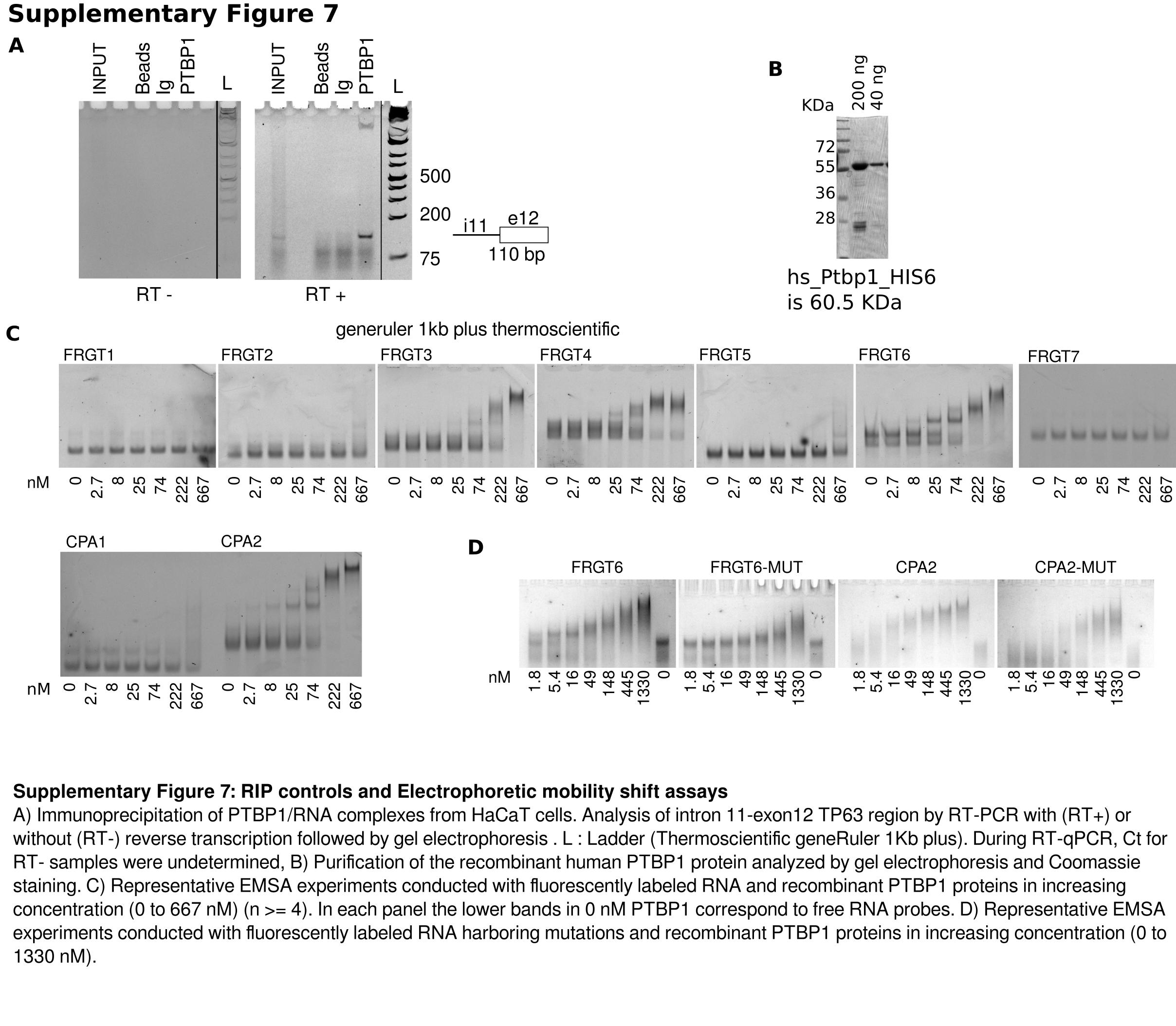 PTBP1 binds specifically to TP63 premRNA sequences. A,TP63 exon 12 genomic locus and positions of the RNAs tested in RNA/protein shift assays. Top lane, RBPmap predicted PTBP1 binding sites. Middle, Positions and names of the RNA fragments tested along the TP63 exon 12 genomic sequence. Bottom lane, nucleotidic conservation among vertebrates. B, Immunopurification of PTBP1/RNA complexes or control experiments (Ig and beads only) from HaCaT cell extracts. Immunopurification was controlled by PTBP1 and PCNA Western blot analysis as indicated in input (10%) or immunoprecipited (IP) samples (top). Protein MW are indicated on the side of the membranes. The asterisk denotes the light chain of the IgG. Bottom, RT-PCR detection of TP63 pre-mRNA with primers located in intron 11 and exon 12. C, Same as B from SCC9 cell extracts. D, qRT-PCR detection in HaCaT cells of different mRNA or pre-mRNA portions of TP63 from IP or control samples relative to input signal. Statistical assessment between PTBP1 and control IP was measured by a Student t test (n = 3). E, PTBP1/RNA-binding curves [bound/(bound + free)] obtained for the indicated RNAs (n ≥ 4). RNA mutated to remove PTBP1 binding sites are shown in gray in A. The calculated Kd and their SD is shown for each plot.