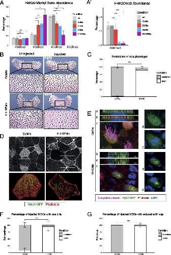 (A, A’) Relative abundance of H4K20 methyl states by mass spectrometry in X. laevis bulk embryonic chromatin upon control (CoMo), single or double KD of SUV4-20H1 and SUV4-20H2 enzymes. (B, C) Representative immunocytochemistry images of multiciliated cells (acetylated a-tubulin) in a tail bud stage embryo upon control or SUV4-20H dKD (inserts show enlarged sections of the same images, scale bars = 1 mm) and (C) quantification of (B) (n = 6 biological replicates). (D, E) Representative immunofluorescence images detailing the multiciliated cell phenotype upon suv4-20h1/2 KD. Basal bodies are green (hyls1-GFP), the cilia are magenta (acetylated a-tubulin antibody), the apical actin meshwork is red (phalloidin) and the nucleus is blue (DAPI). (E) Confocal analysis of the actin meshwork and docked basal bodies in CoMo or H1H2Mo-injected MCC. Panels show: 1—a representative MCC, 2—overlap between the actin cap and basal bodies on the apical surface, 3—basal bodies in only the uppermost Z-sections, 4—an apical view of the basal bodies, 5—a deep Z-section close to the cell nucleus. (F, G) Quantification of the number of MCCs showing reduced cilia and filamentous actin staining after confocal analysis. We measured 144 CoMo and 163 H1H2Mo-injected multiciliated cells. Error bars represent standard deviations. |