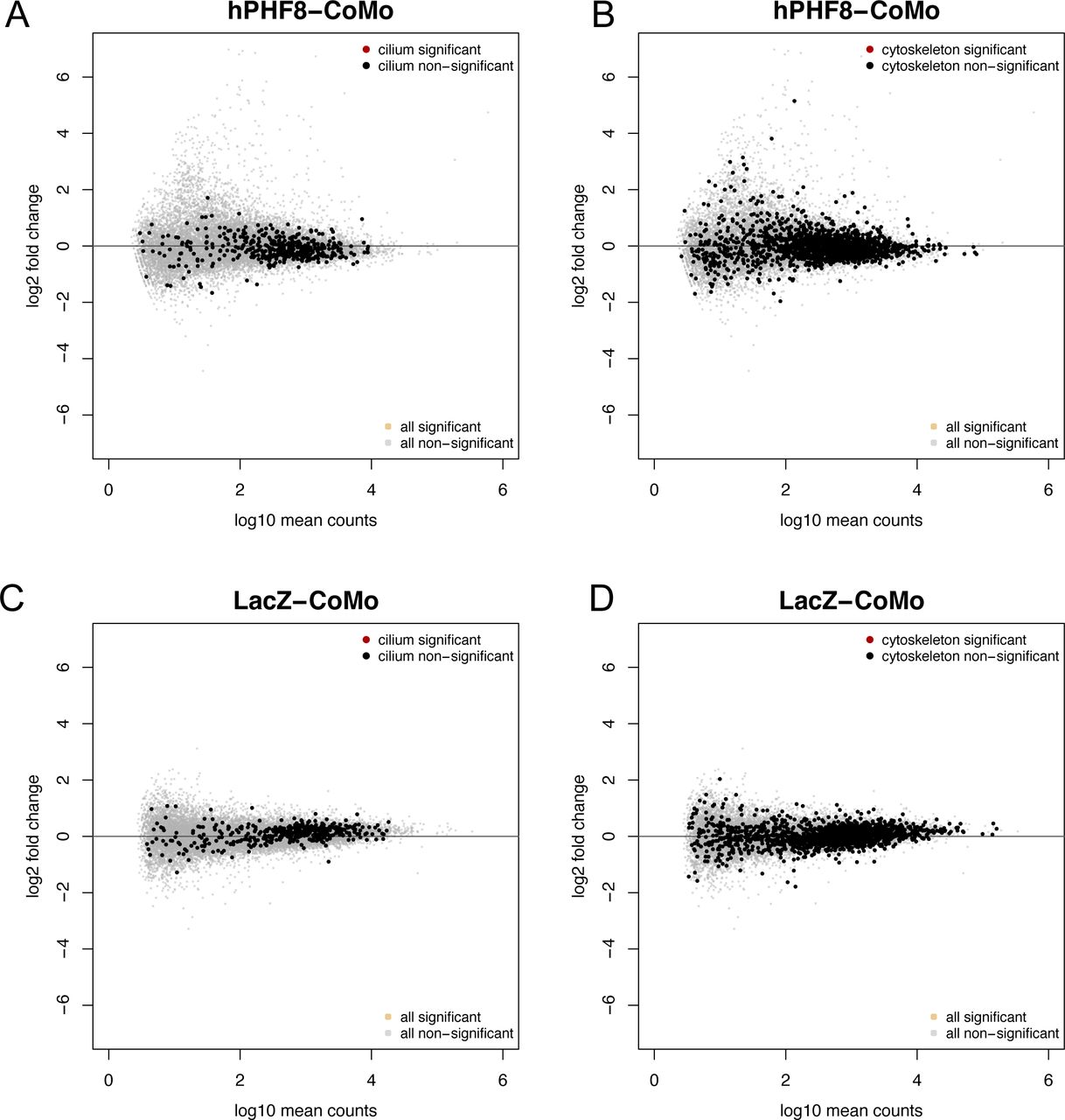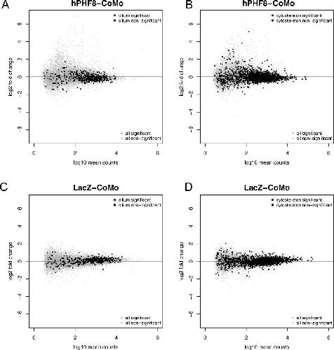(A, B, C, D) MA plots depicting gene expression in hPHF8 mRNA (A, B) or LacZ (C, D)-injected ACs normalized to control morpholino-injected ACs. Each dot represents a single gene. Nonsignificant genes are indicated in light grey. (A, B, C, D) Cilium (A, C) and cytoskeleton (B, D) genes are indicated in black (nonsignificant, Padj > 0.05). There are no significantly misregulated genes in hPHF8 or LacZ-injected animal caps.