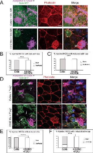 Figure S2. The cilia phenotype of SUV4-20H1/H2 KD embryos is not rescued by exogenous Mci/IDAS or Foxj1.(A) Embryos were injected mosaically in 1 blastomere at the 8-cell stage with control or suv4-20h1/2 morpholinos together with mci-hGR mRNA. Basal bodies in green, actin cap in red, ciliary axonemes in magenta, and DNA in blue. * = injected MCC, wt = wildtype MCC, arrows indicate ectopic cilia. Scale bars = 10 μm. (B, C) Quantification of the rescue of cilia (B) and actin cap (C). Eight fields of view from eight CoMo-injected embryos and seven fields of view from seven H1H2Mo-injected embryos were scored. (D) Embryos were injected mosaically with CoMo or H1H2Mo together with foxj1 mRNA. Scale bars = 10 μm. (E) Quantification of the rescue of cilia (E) and actin meshwork. Five fields of view from five embryos were scored. |