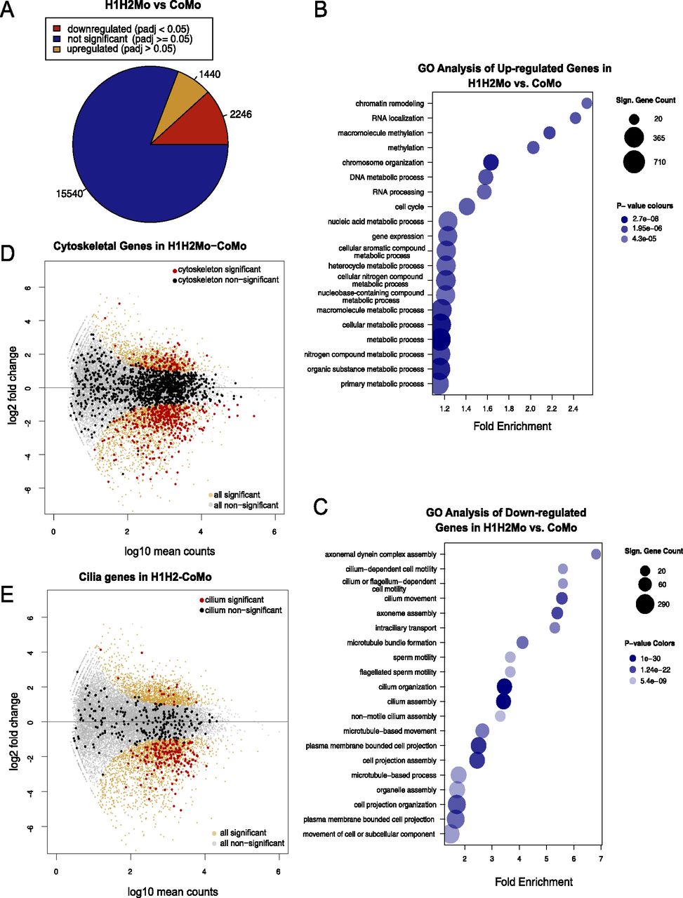 (A) Number of misregulated genes in SUV4-20H1/2-deficient ACs (Table S3). (B, C) Gene ontology (GO) analysis for up-regulated genes (B) and down-regulated genes (C) in suv4-20h1/2 morpholino-injected ACs normalized to control morpholino-injected ACs. Bubble size represents the number of significant genes per GO term and bubble colour represents P-value. (C) GO analysis for down-regulated genes in suv4-20h1/2 morpholino-injected ACs. Bubble size represents the number of significant genes per GO term and bubble colour represents P-value. (D, E) MA plots showing gene expression in suv4-20h1/2 morpholino-injected ACs. Each dot represents a single gene. Nonsignificant genes are indicated in light grey and significant in orange (Padj < 0.05). Cytoskeleton genes and cilium genes (as defined by R/Bioconductor package: org.Mm.eg.db version 3.8.2, mouse annotation) are indicated in black (nonsignificant, Padj > 0.05) and red (significant, Padj < 0.05). Data normalized to control morpholino-injected animal caps. |
