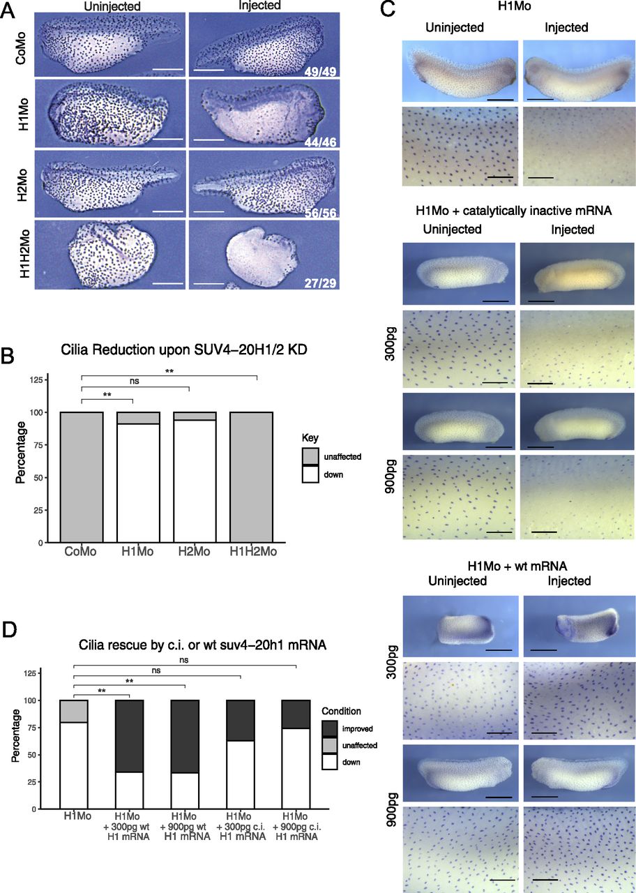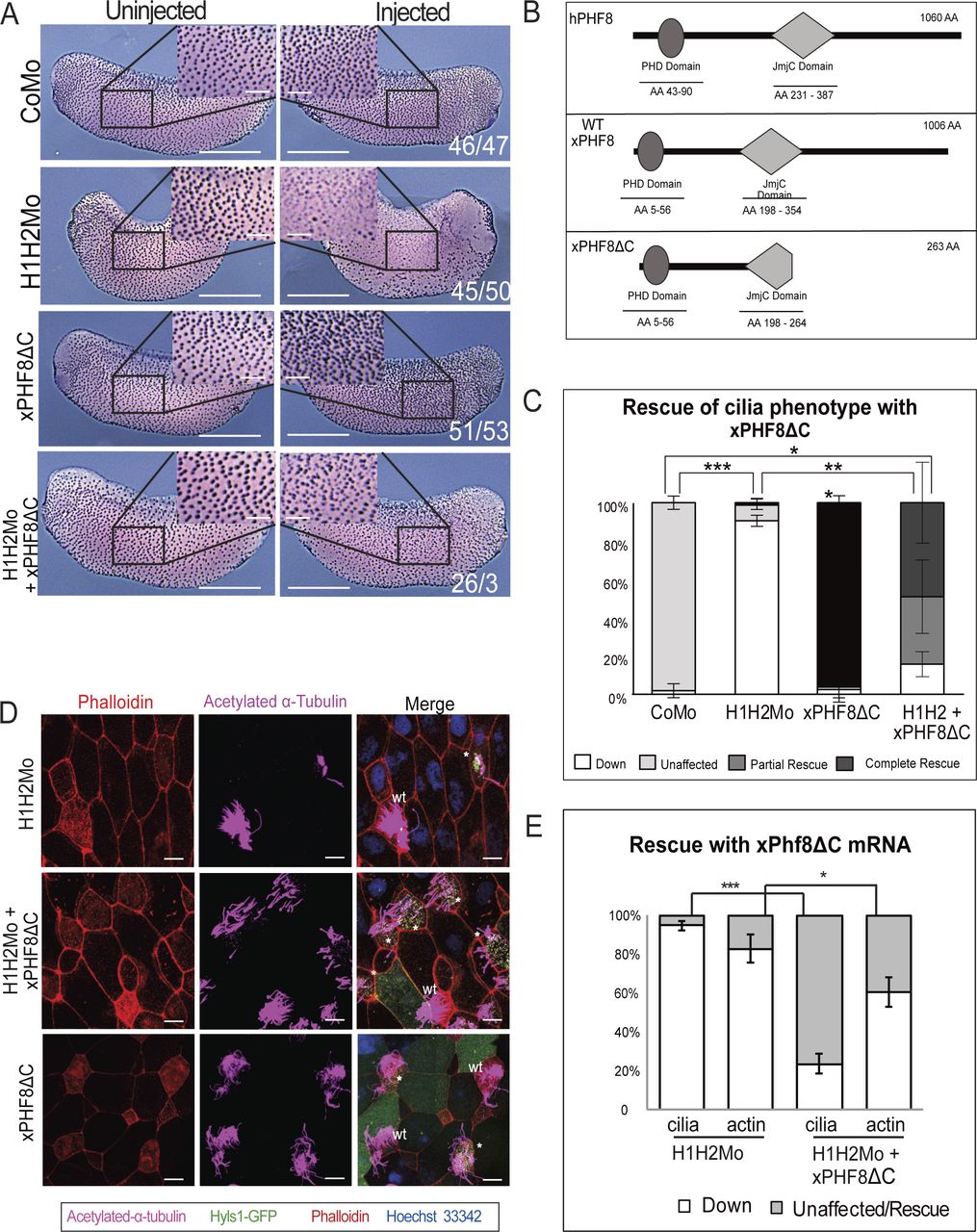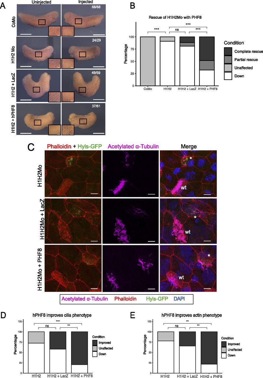 Rescue of ciliogenic phenotype in H1 Mo embryos with hPHF8.