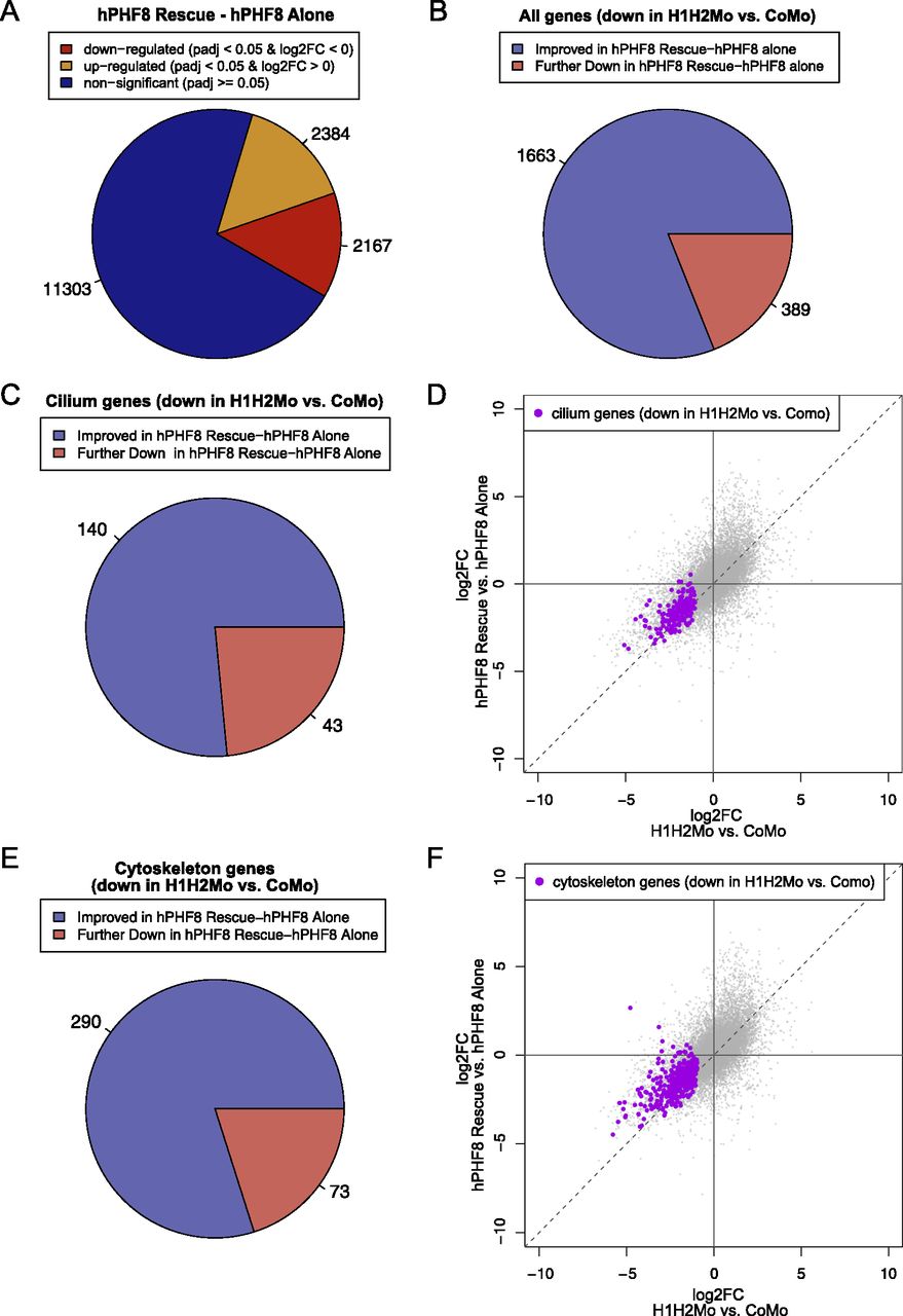 (A) Number of misregulated genes in hPHF8 Rescue (H1H2Mo + hPHF8 mRNA injected ACs) normalized to hPHF8-alone ACs. (B, C, E) Change in expression of all genes (B), cilium genes (C) or cytoskeleton genes (E) that were down-regulated by SUV4-20H1/2 knockdown upon hPHF8 rescue. To investigate whether transcript levels of cilium and cytoskeleton genes, which were down in the initial SUV4-20H1/2 KD dataset, had improved, we compare the log2fold change between H1H2Mo versus CoMo-injected animal caps to log2 fold change of hPHF8 Rescue versus hPHF8-injected animal caps. (D, F) shows the result for cilium genes and (F) for cytoskeleton genes. Dashed line indicates no difference in expression upon hPHF8 rescue. Genes above the line have improved expression and genes below the line are further down-regulated. (n = 3 biol. replicates). |