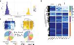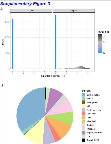 Supplementary Figure 3: (A) Distribution of distances between selected regions (refer to Supplementary Table 3) and genome elements: genes (left) and repeats (right). (B) Distribution of the closest genomic elements (both genes and repeats) for each selected region.