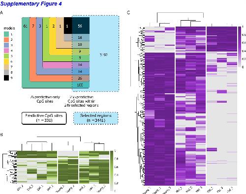 Supplementary Figure 4: (A) Overlap between the 331 predictive CpG sites (divided by the number of models they appear in) and the 3441 selected regions (light blue). (B) DNA methylation levels of the predictive CpG sites not overlapping with the selected regions (green gradient). (C) DNA methylation levels of the predictive CpG sites overlapping with the selected regions (purple gradient).